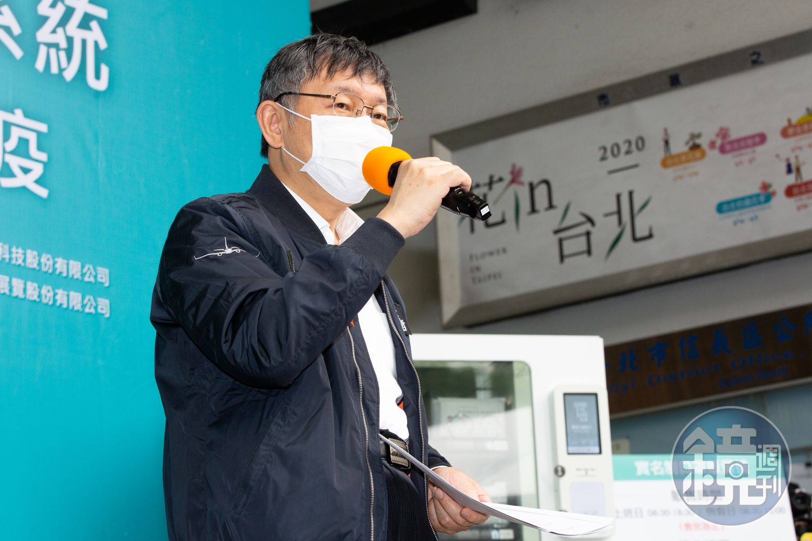 疫情持續流行,即使政府推出口罩實名制,讓民眾可以網路預購、超商取貨,仍有不少民眾在藥局排隊購買口罩。對此,柯文哲11日於口罩販賣機上線記者會上直言「看到大家排隊買口罩我受不了!」,並在13日揚言下週12個行政區都要建置口罩販賣機。