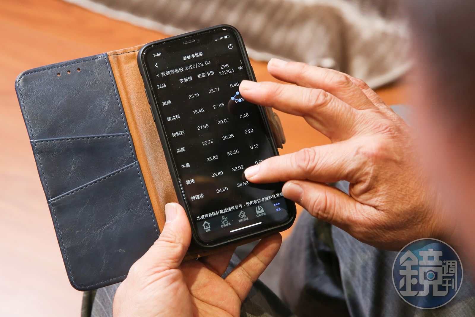 「我不會去關注自營商、投信、外資在買的股票,因為自己沒能力跟他們玩,我更強調安全性。」鄭金鴻篩選股票的第一步是看股價淨值比,介於0.3至0.5倍、股價在10至15元才會納入口袋名單。接著再觀察產業面與籌碼面。」