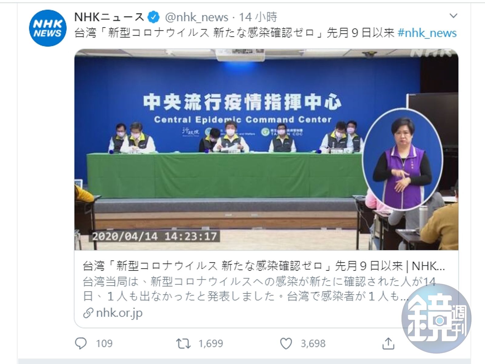 台灣自疫情爆發就全力投入防疫工作,昨日更成功達到案例0確診,這也是繼3月9日後再度出現單日無新增確診案例,這振奮人心的好消息更傳到日本,日媒NHK更於14日晚間刊出報導,並在推特轉發連結。