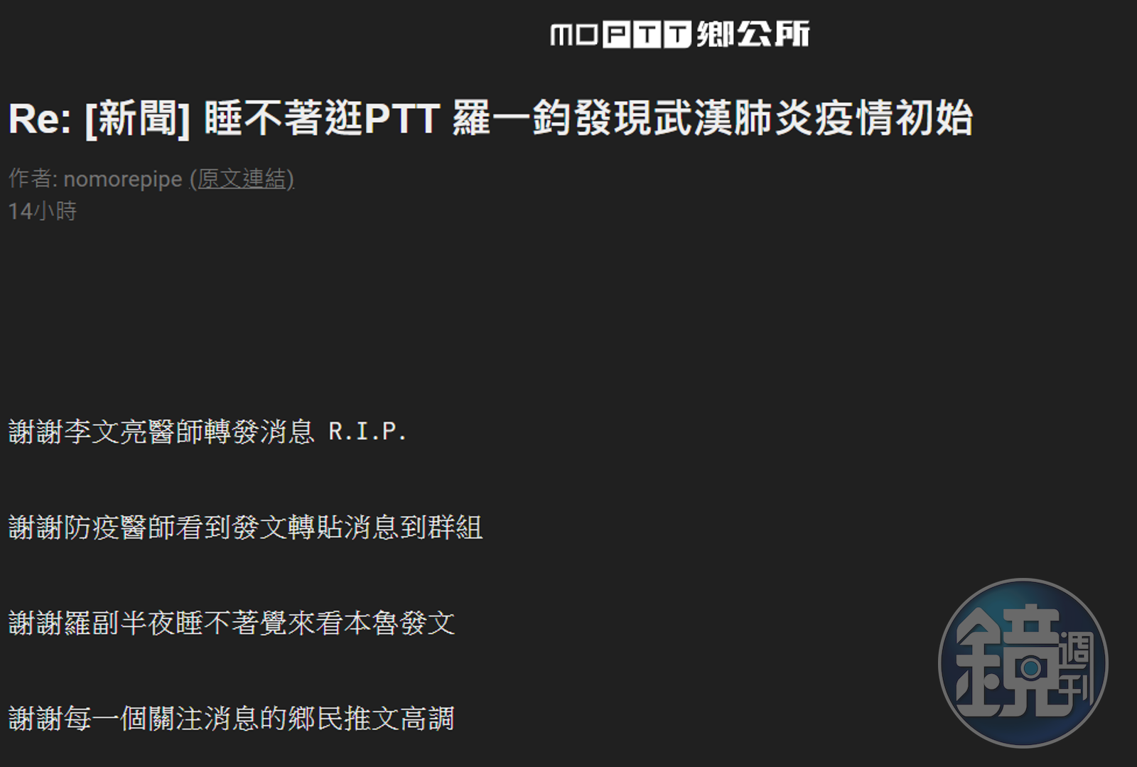 被冠上「護國神文」榮銜的網友nomorepipe指出,要感謝的人太多了,首先要謝謝已過世的李文亮醫師轉發消息,以及防疫醫師、羅副署長看到他的發文轉貼,還要謝謝每一個關注消息的鄉民推文「幫高調 」。