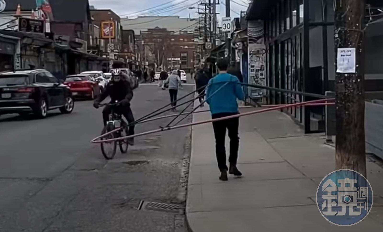 影片中可見,戴著半徑2公尺的粉紅色橡膠圈在路上行走,無論走到哪都會有問題,不是撞到人、電線桿、垃圾桶,就是直接撞到在馬路上行駛的自行車或汽車,甚至因人行道過於狹窄,為了保持安全距離他常常被迫走到車道上。