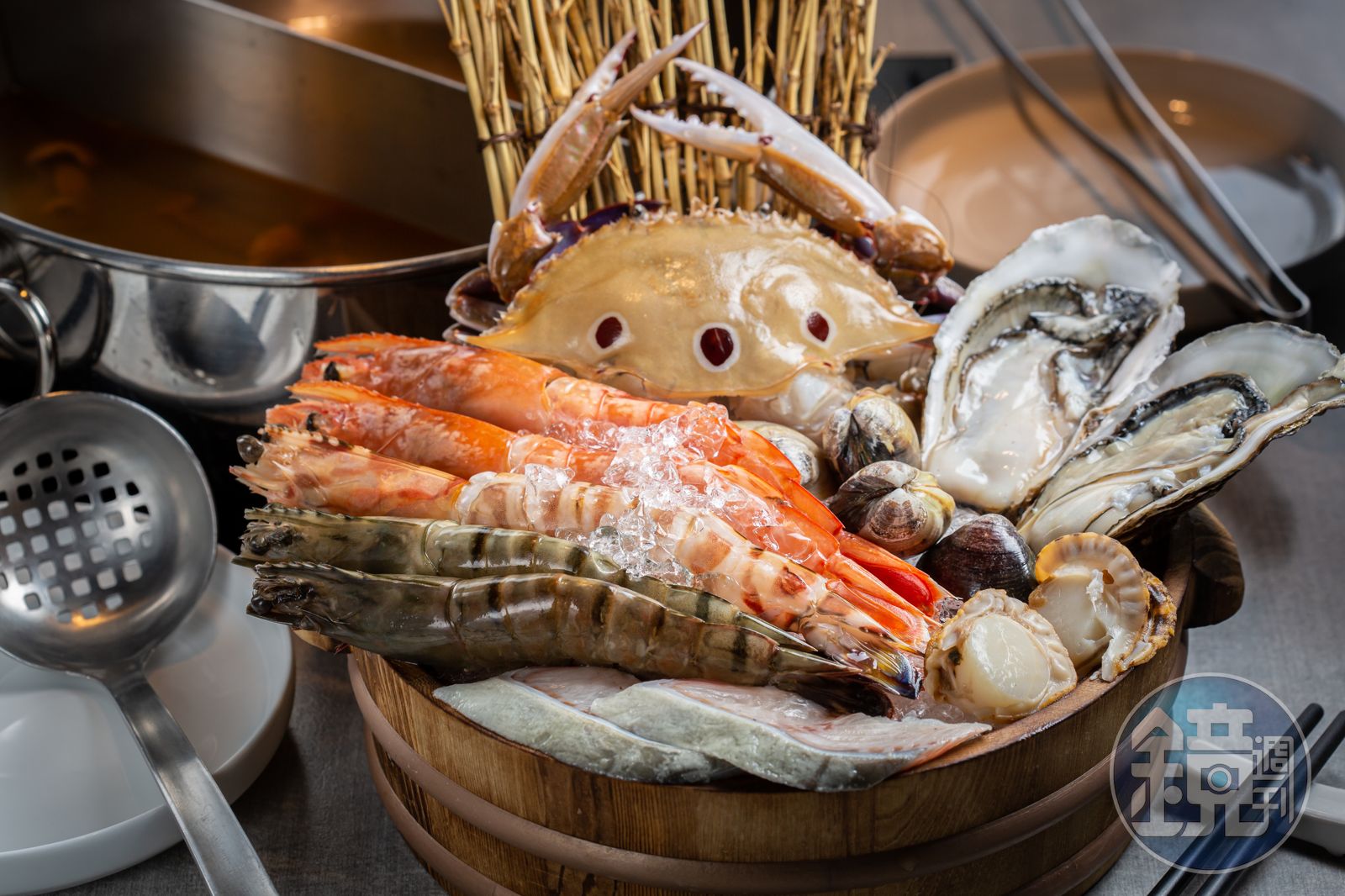 湯頭、沾醬都如此費工,食材當然也得匹配,兩人份的海鮮盤一上來,三點蟹、生蠔、帆立貝、文蛤已經先聲奪人,還有明蝦、天使蝦、草蝦押陣,魚片則是每天進貨的鮮魚,今天上場的是膠質豐富的海鰻。