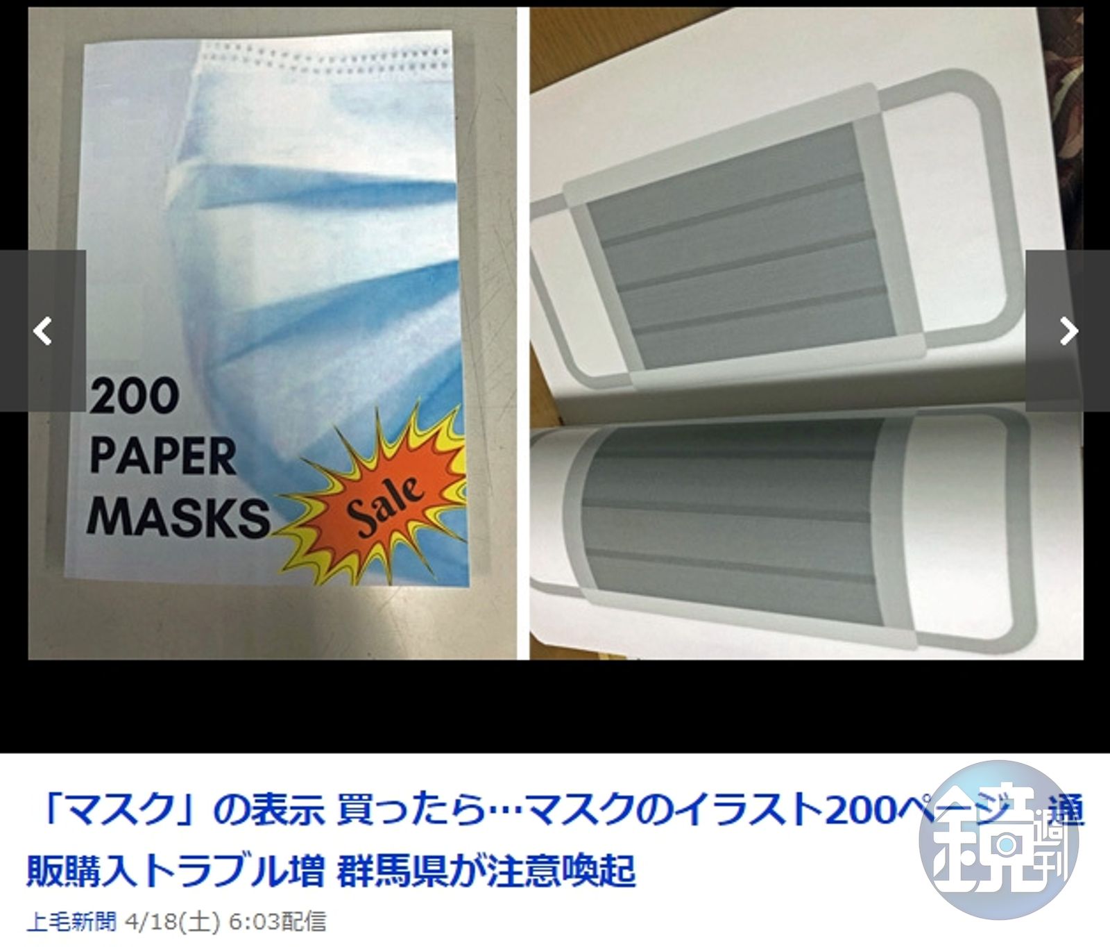 人民為了自救,找遍各種可以購買口罩的管道,也因此傳出一些詐騙的案例。根據日本媒體《上毛新聞》報導,日本群馬縣一名57歲婦女,在大型購物網站上看到一樣商品,商品名寫著「200個紙口罩(200 PAPER MASKS)」,價錢還只要1,539日元(約新台幣430元),她不疑有他,馬上就下單訂購了2份。