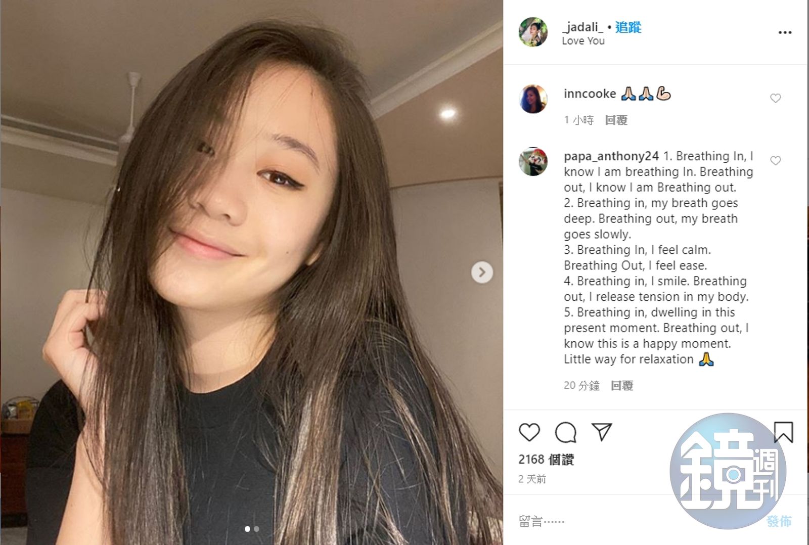 Jada上傳的自拍照,神情看似輕鬆,心情卻不愉悅,她表示,自己想說的話並不是讓人快樂的事,因為被迫隔離,心情相當憂鬱,她寫著:「隔離確實對我的心理健康造成傷害,我有焦慮和重度抑鬱症的長期病史,目前嚴重復發。」