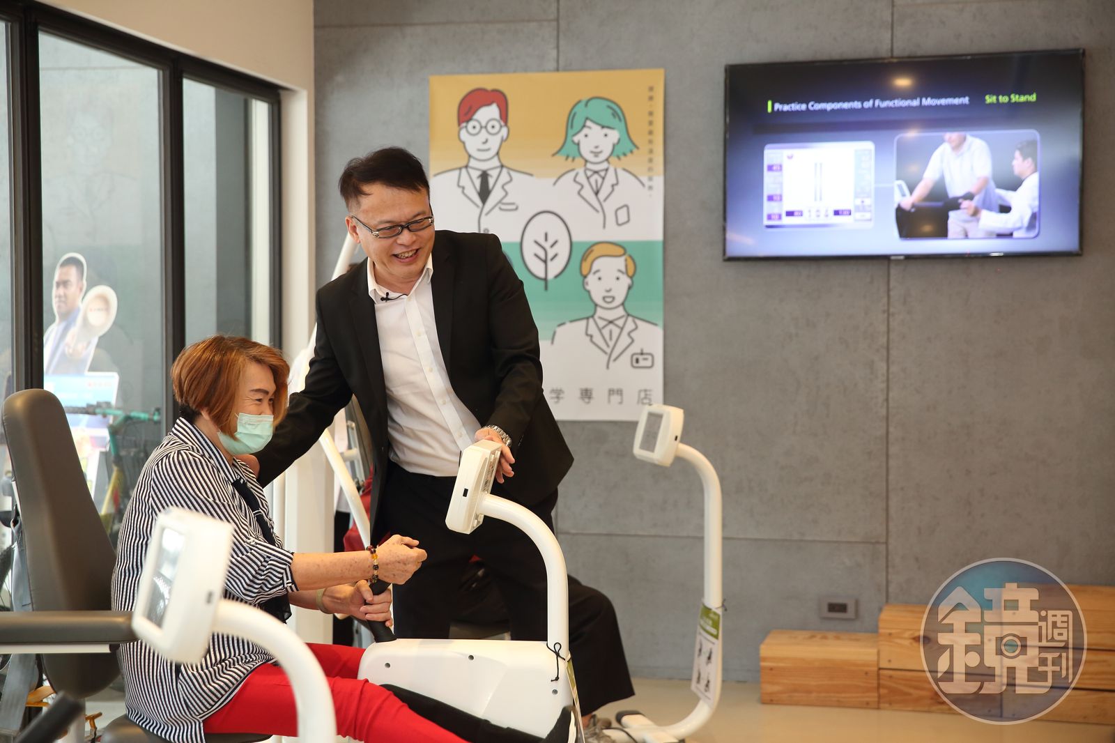 採訪這日,幾家大型連鎖藥局老闆低調參訪,廖俊吉興奮地透露:「有人說好像看到迪士尼樂園版的藥局,老人家有運動,又能交朋友,都很開心,我們獨家代理這些器材,也協助建構這樣的模式,歡迎有相同理念的人合作。」