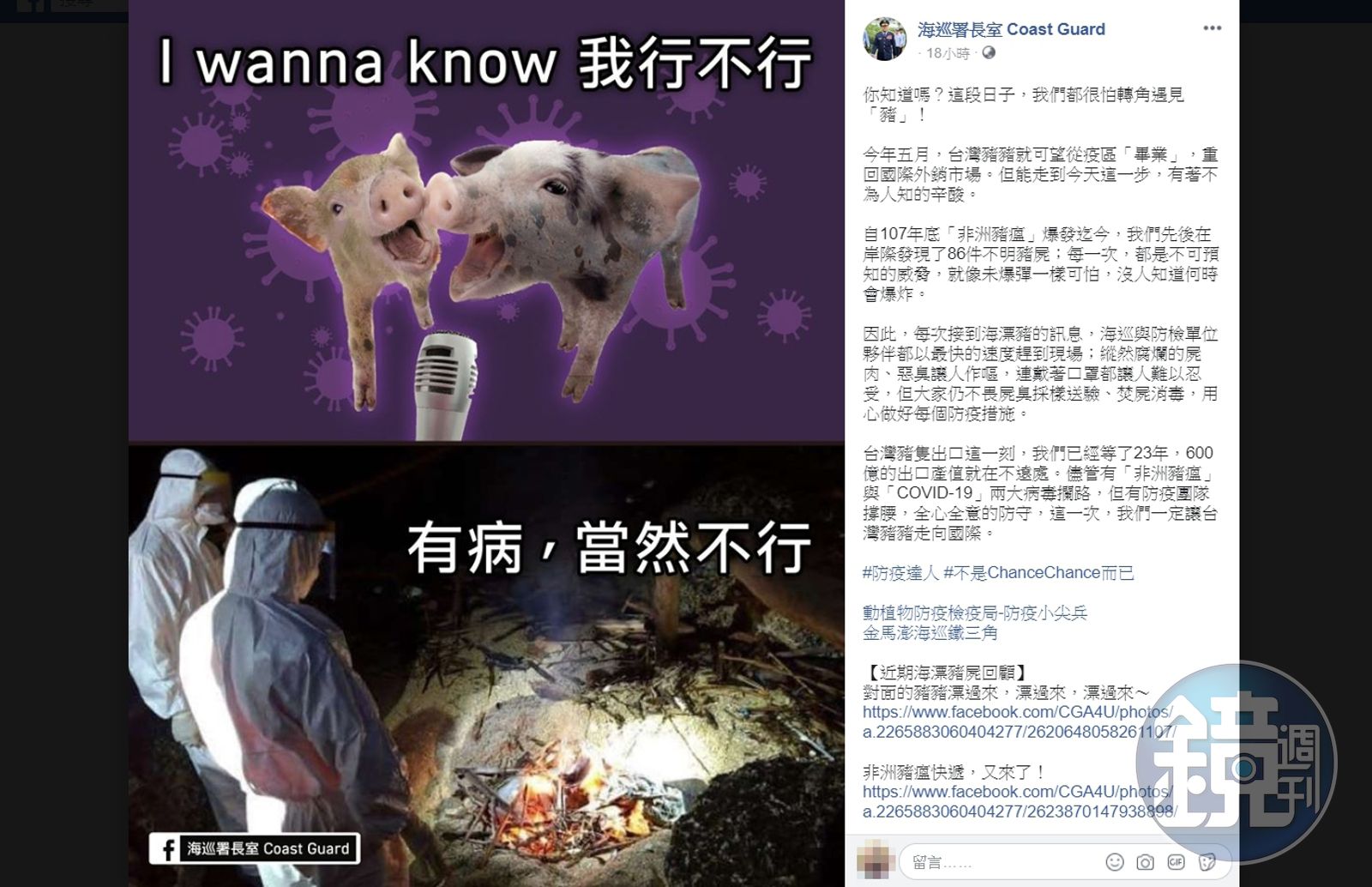 海巡署長室在23日晚間po出一則圖文,圖上方有2隻小豬,背景都是病毒,牠們開心的高唱著一句歌詞:「I wanna know 我行不行」,正是改編自羅志祥的歌曲〈精武門〉。下圖則是檢疫人員全副武裝,站在火堆前說道:「有病,當然不行。」亦即帶有病毒的豬隻絕對禁止入境台灣。