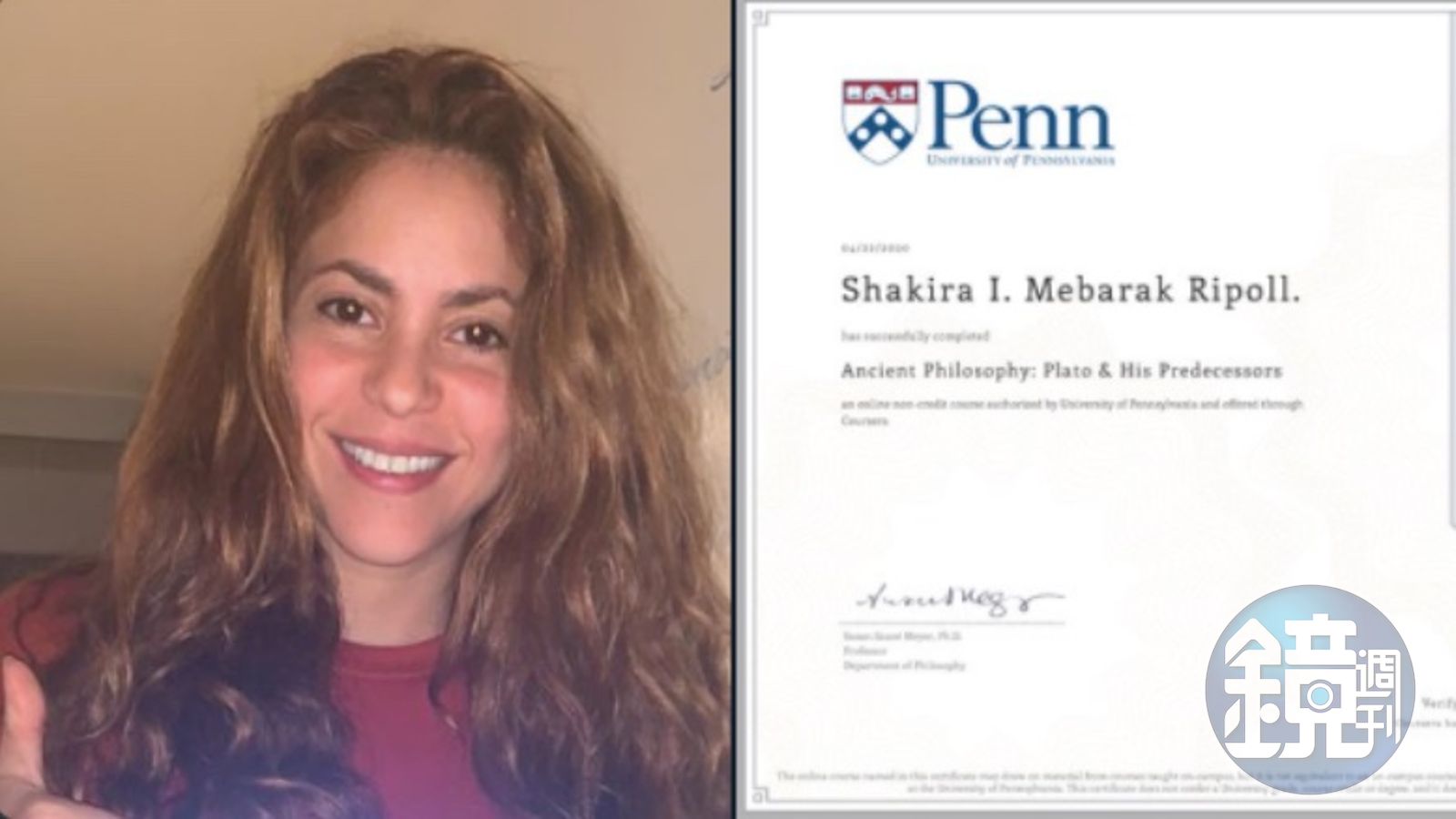 夏奇拉在推特發文說,自己終於完成4個星期的線上古典哲學課,「我知道,我的興趣未免也太廣泛了點,但這都是利用小孩睡覺後的時間上的課。」