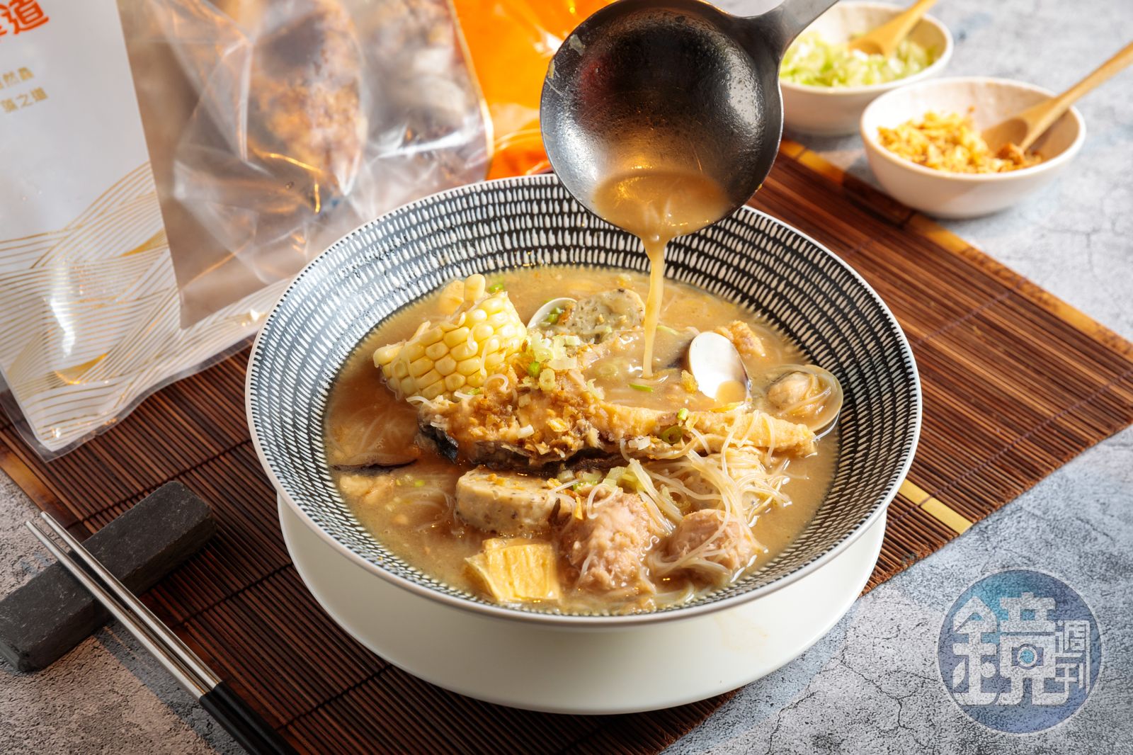 材料(1至2人份):Hi-Q鱻食「褐藻金鯧炊粉」1包(220元),另準備水果玉米1條、芋頭角適量、蛤蜊適量,油蔥酥、芹菜珠少許。