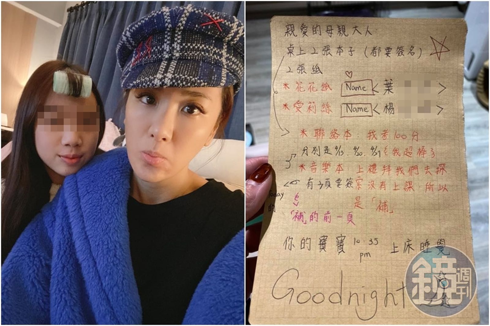 Emma以工整的字跡寫下紙條,開頭先以「親愛的母親大人」稱呼小禎,接著幫同學要小禎的簽名,再告訴媽媽要簽聯絡本和音樂本,還炫耀自己「我考100分,我超棒」,最後寫下「你的寶寶10:35pm上床睡覺,Good night」,還畫上星星和月亮的插圖點綴。