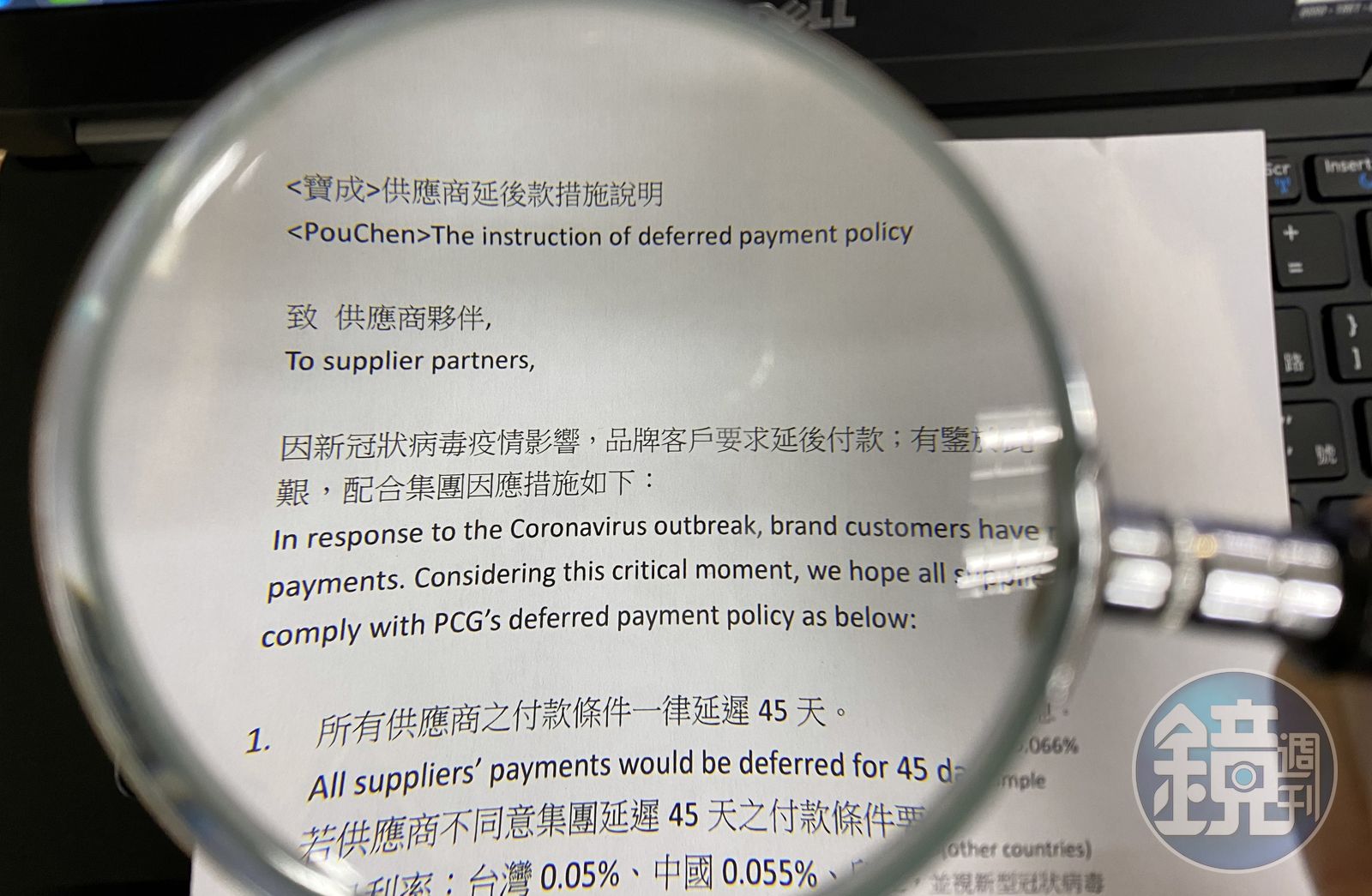 骨牌效應發酵,不只員工受拖累、就連供應商也被寶成提出「延遲付款」的要求,根據本刊獨家取得資料顯示,寶成17日已發函給所有往來廠商,內文提到:「因新冠狀病毒疫情影響,品牌客戶要求延後付款…所有供應商付款條件一律延遲45天…若不同意延遲付款,則需按日加計利息…。」