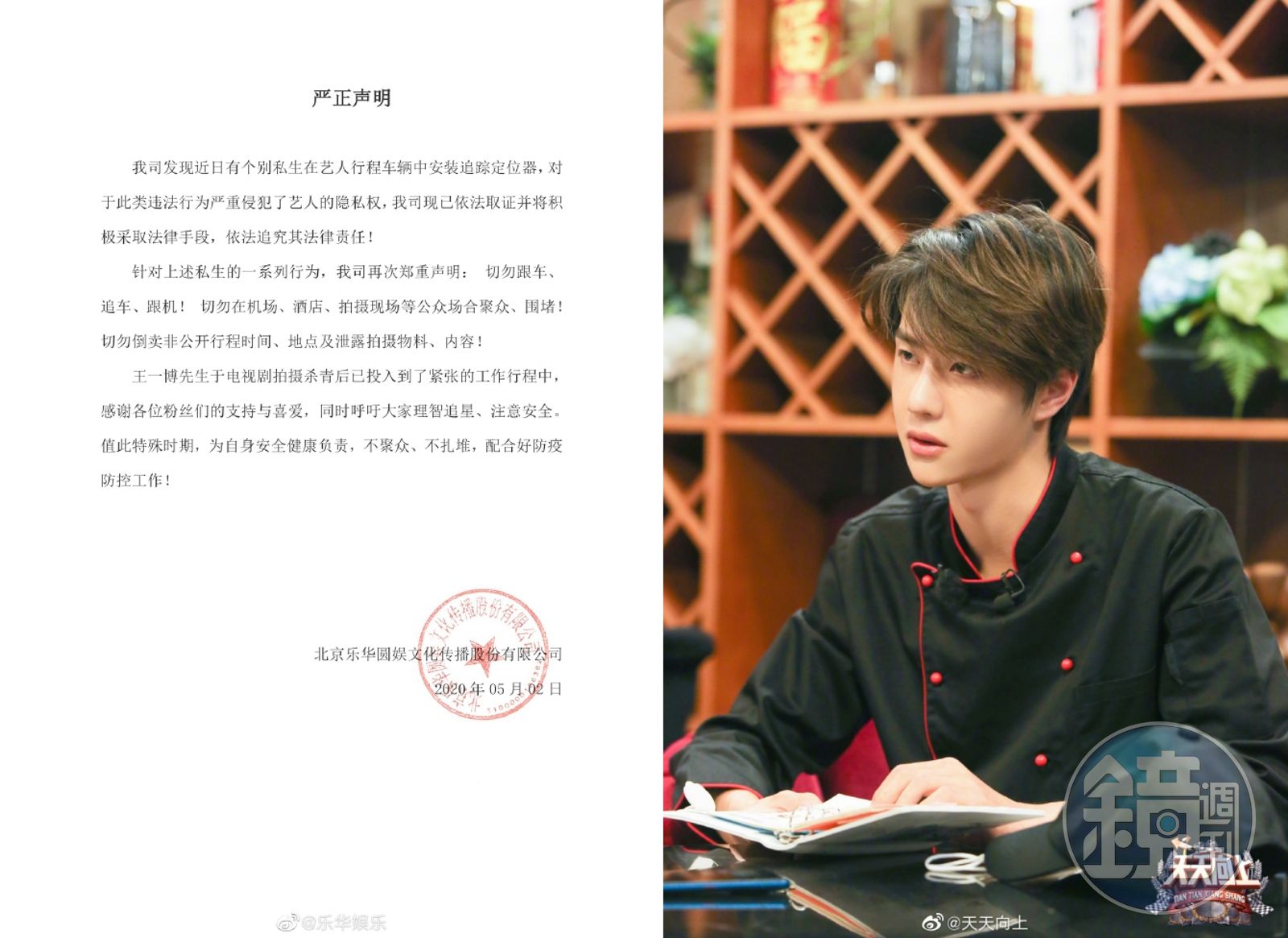 樂華娛樂發布嚴正聲明,「發現個別私生在藝人行程車輛安裝追蹤定位器,對於違法行為嚴重侵犯藝人隱私權,已依法採證並將採取法律手段。」樂華娛樂重申反對私生飯行為,要求粉絲勿跟車、追車或跟機,「切勿在機場、酒店、拍攝現場等公眾場合聚眾圍堵」,並要求勿倒賣非公開行程的時間地點,禁止洩露拍攝內容。