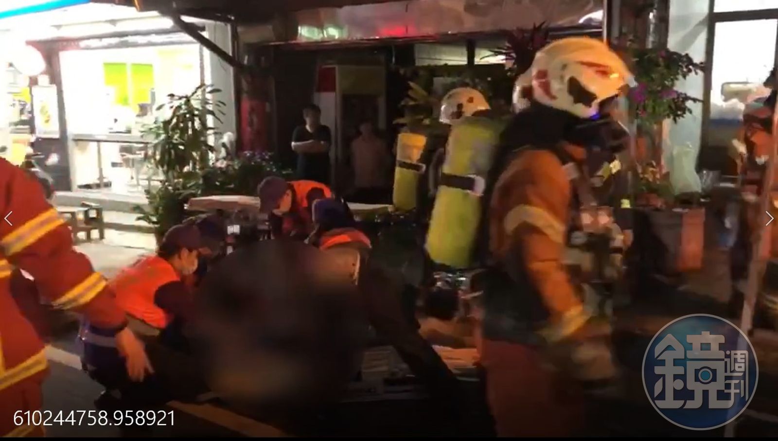 游女被救出時呈現昏迷狀態,救護人員趕緊在現場急救。(翻攝畫面)2人被救出時都已不省人事,林男更已經沒了生命跡象,救護人員趕緊將2人送醫,游女到院後所幸恢復意識,林男則遺憾地被醫院宣告死亡,消防隊員在凌晨2點47紛將火勢撲滅,至於起火原因則有待進一步釐清。