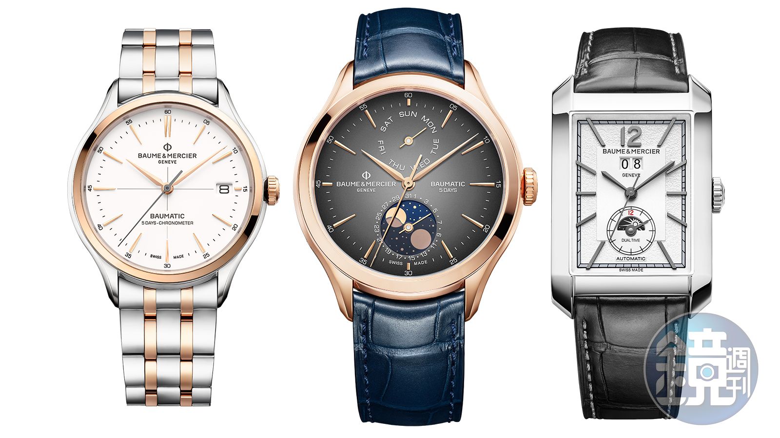 (左)Baumatic日期月相腕錶|不鏽鋼材質/錶徑42mm/時間、日期及月相指示/BM14自動上鏈機芯/防水50米/建議售價NT$ 130,200(右)Baumatic大三針日期自動腕錶|不鏽鋼材質/錶徑40mm/時間及日期指示/BM13自動上鏈機芯/C.O.S.C.瑞士官方天文台認證/防水50米/建議售價NT$ 93,500系列的另外兩款新作包括前面提到,同樣搭載BM14自製機芯的日期月相款、以及搭載BM13自製機芯通過C.O.S.C.天文台認證的大三針日期款。大三針日期款之前就推出過,今年的改款是換上漸層灰面、以及推了半金的款式,在顏色和材質配置上做了新的嘗試。