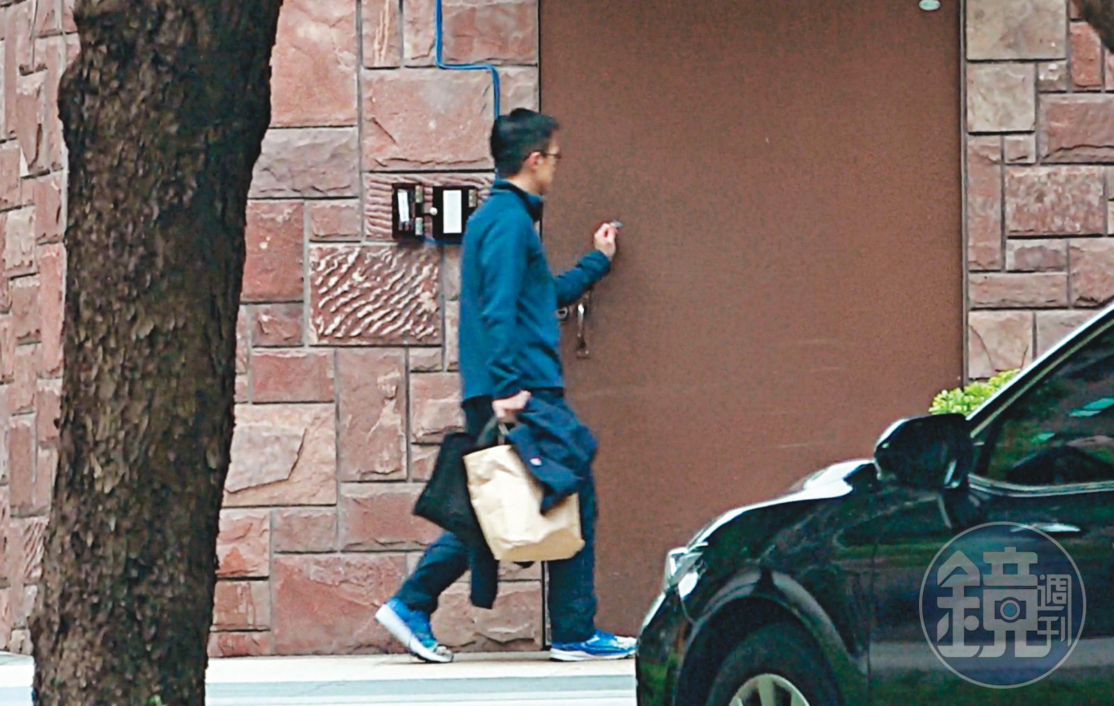 4/25 09 : 40 吳彭弘(圖)週六一早就出現在愛巢,熟門熟路地拿感應卡自行刷進去,儼然一副男主人的模樣。