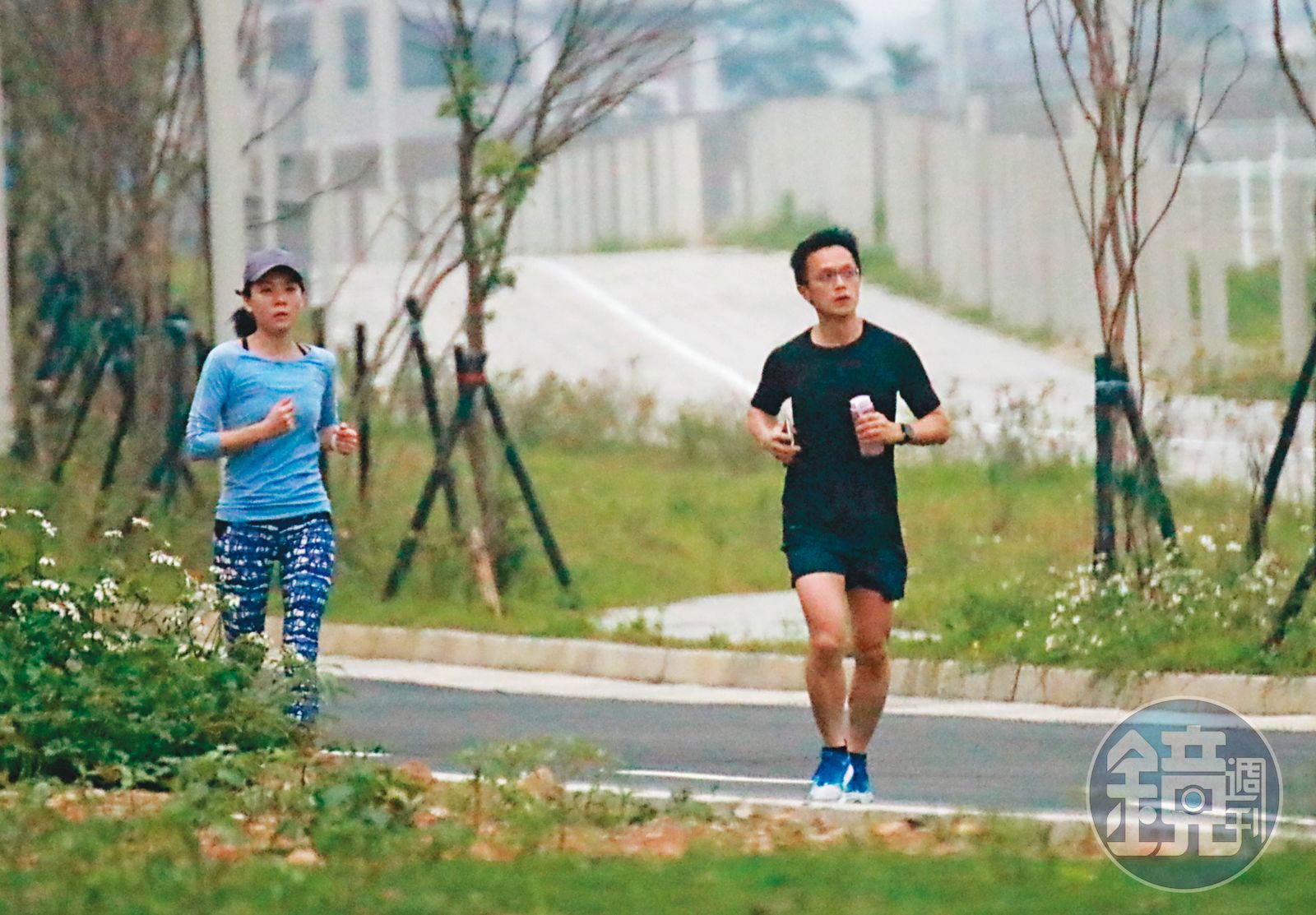 4月11日 12 : 53,吳彭弘(右)與簡芳貞(左)週末約會的行程,都是一起到捷運山鼻站旁路跑,吳跑步架式十足,看起來體力過人。發布時間:2020.05.06 05:58 臺北時間