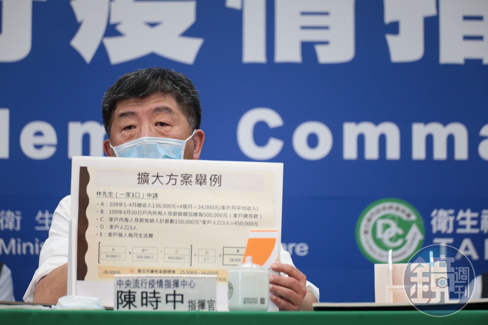 根據衛福部日前所公布,「家戶每人每月生活費」公式計算方法為〔家戶月平均收入+(家戶總存款-15萬元*家戶人數)〕/家戶人數,讓不少民眾搞得一頭霧水,昨(5)日連衛福部長陳時中親自試算時,都坦言有點難算。