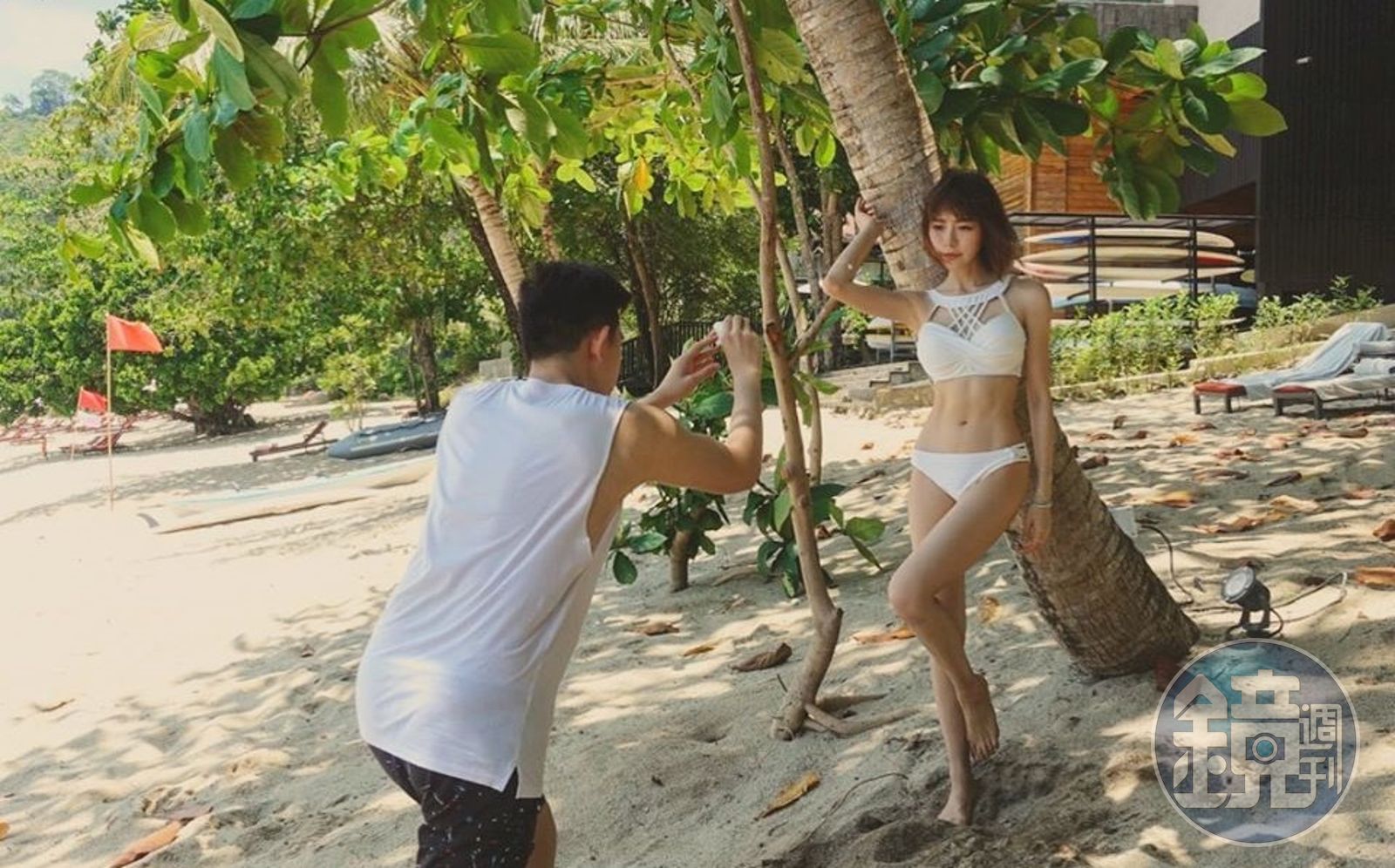 林明禎穿著全白泳衣,白皙肌膚一覽無遺,腰上的兩條馬甲線超級明顯,還有穠纖合度的雙腿線條,四塊腹肌也清晰可見,引起討論的是,掌鏡者的真實身分正是林明禎的弟弟,看到成果照她滿意地說:「有求必應的小寶弟。」沒想到引起姊姊抗議留言,「我也在旁邊打燈、遮傘、拿衣服、導演、補妝、拍你的,好不好!」她看了則笑回:「最好是!」