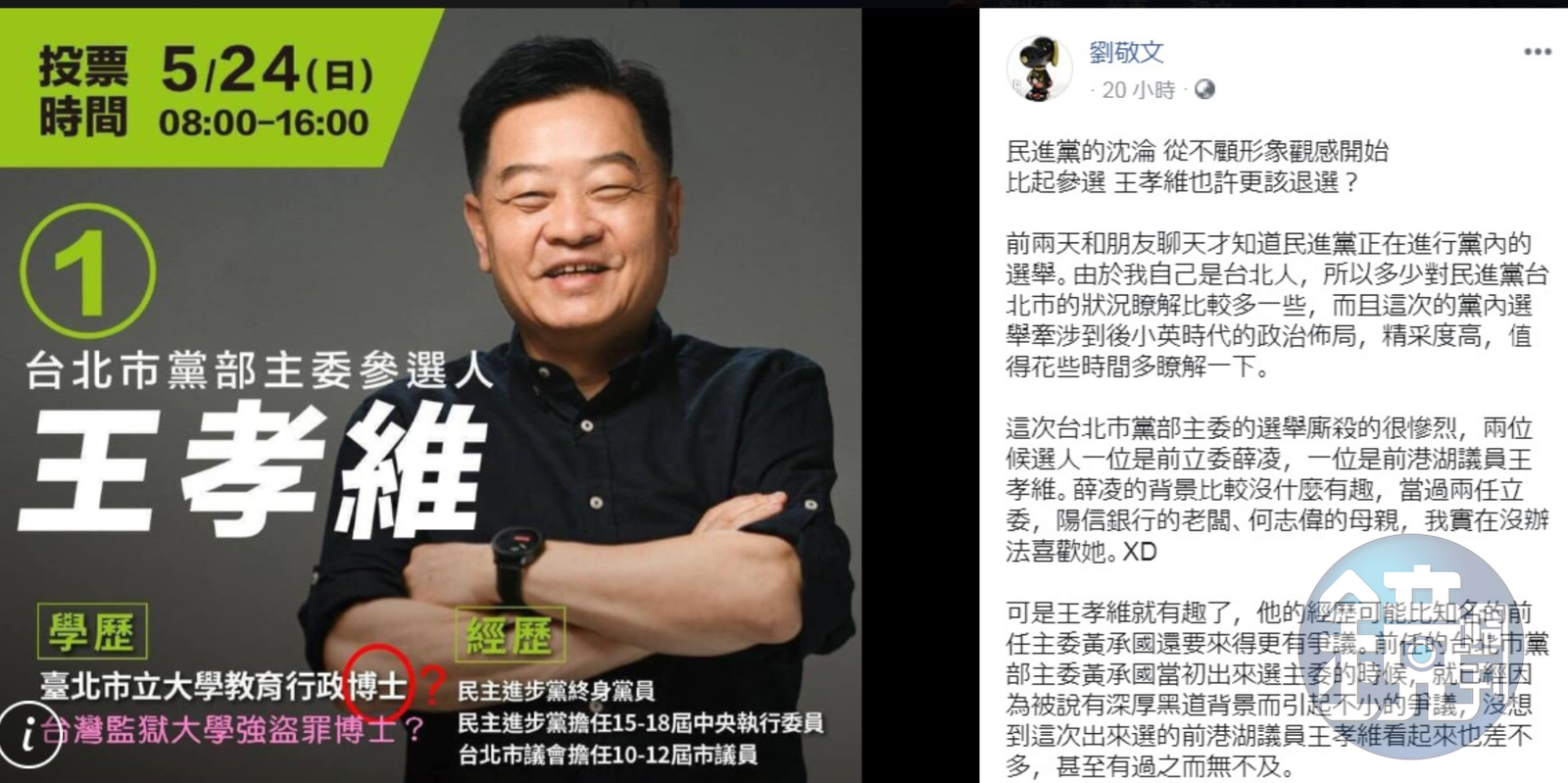 至於王孝維,妖西文中指出,王的經歷可能比知名的前任主委黃承國還要來得更有爭議。前任的台北市黨部主委黃承國當初出來選主委的時候,就已經因為被說有深厚黑道背景而引起不小的爭議,沒想到這次出來選的前港湖議員王孝維看起來也差不多,甚至有過之而無不及。