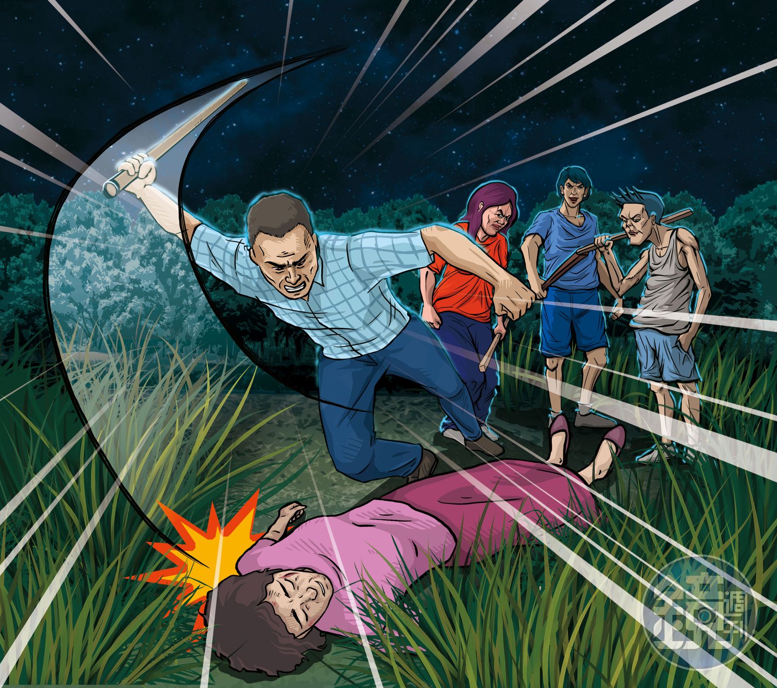 2個學徒依照老闆指示,拿著預藏的毛巾想勒死陳金里,但毛巾太短,昏迷中陳女一掙扎毛巾就脫手,接著邱清彥將陳金里踢下車,由賴慧慈拖到山區產業道路,她先打了第一棍,2個小徒弟接手打了幾下,都不夠狠,乾脆,邱清彥自己出手,朝著頭部往死裡打!