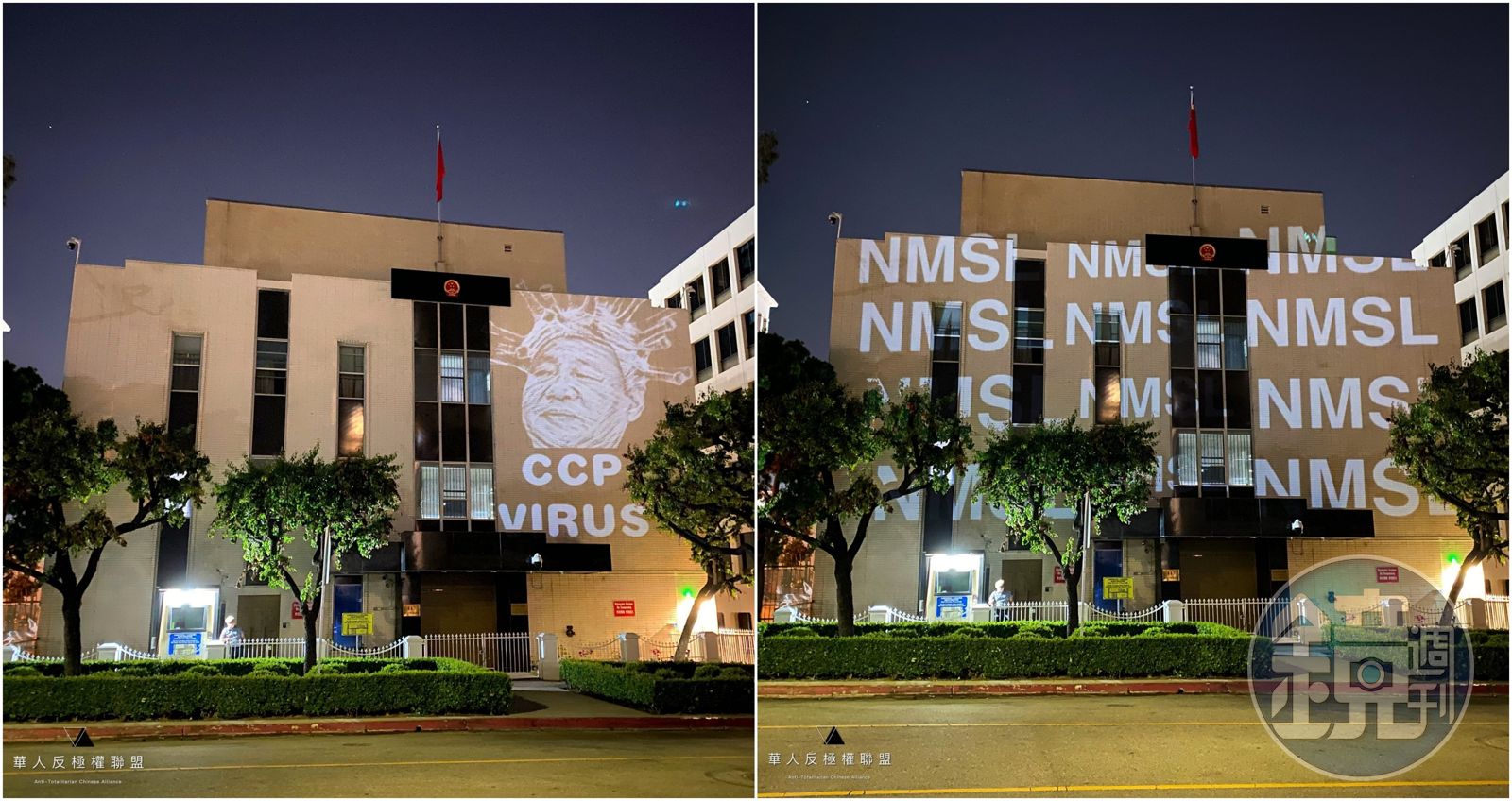 推特上瘋傳,自媒體人曾錚(Jennifer Zeng)分享數張照片,寫著「有人把洛杉磯中領館給裝飾了一下。」照片中,中國駐洛杉磯領事館最近被人用投影的方式,出現了「CCP VIRUS(中共病毒)」的字樣,還將習近平的頭上戴了一個冠狀病毒的頭套,指控疫情是中共起源的。此外還有中共網軍們在筆戰時常用的詛咒口語「NMSL(你媽死了)」,投滿整個中領館外觀。 中共網軍們在筆戰時常用的詛咒口語「NMSL(你媽死了)」,也投滿整個領館外觀。(翻攝Jennifer Zeng 曾錚 推特)華人反極權聯盟創辦人關堯也在推特分享,寫道「揚我國威,熱詞上牆。」不過其實,這個手法去年在香港反送中抗爭時就他們就曾經對領事館用過了,當時投影的字樣為「FREE HONGKONG」,為香港民眾發聲。 民眾用投影方式,紀念人權律師高智晟失蹤第1000天。(翻攝Jennifer Zeng 曾錚 推特)同時,昨(10日)母親節也是中國維權律師高智晟「被失蹤」第1,000天。高智晟律師曾幫法輪功學員訴訟,幫忙多起敏感案件,並非第一次遭到迫害,2006年就曾被以「煽動顛覆國家政權罪」逮捕入獄,2014年才獲釋,不料2017年8月他再度失蹤,至今已經超過1,000個日子,洛杉磯中國領事館外頭也特地投影出高智晟的容貌,呼籲大家持續關注。
