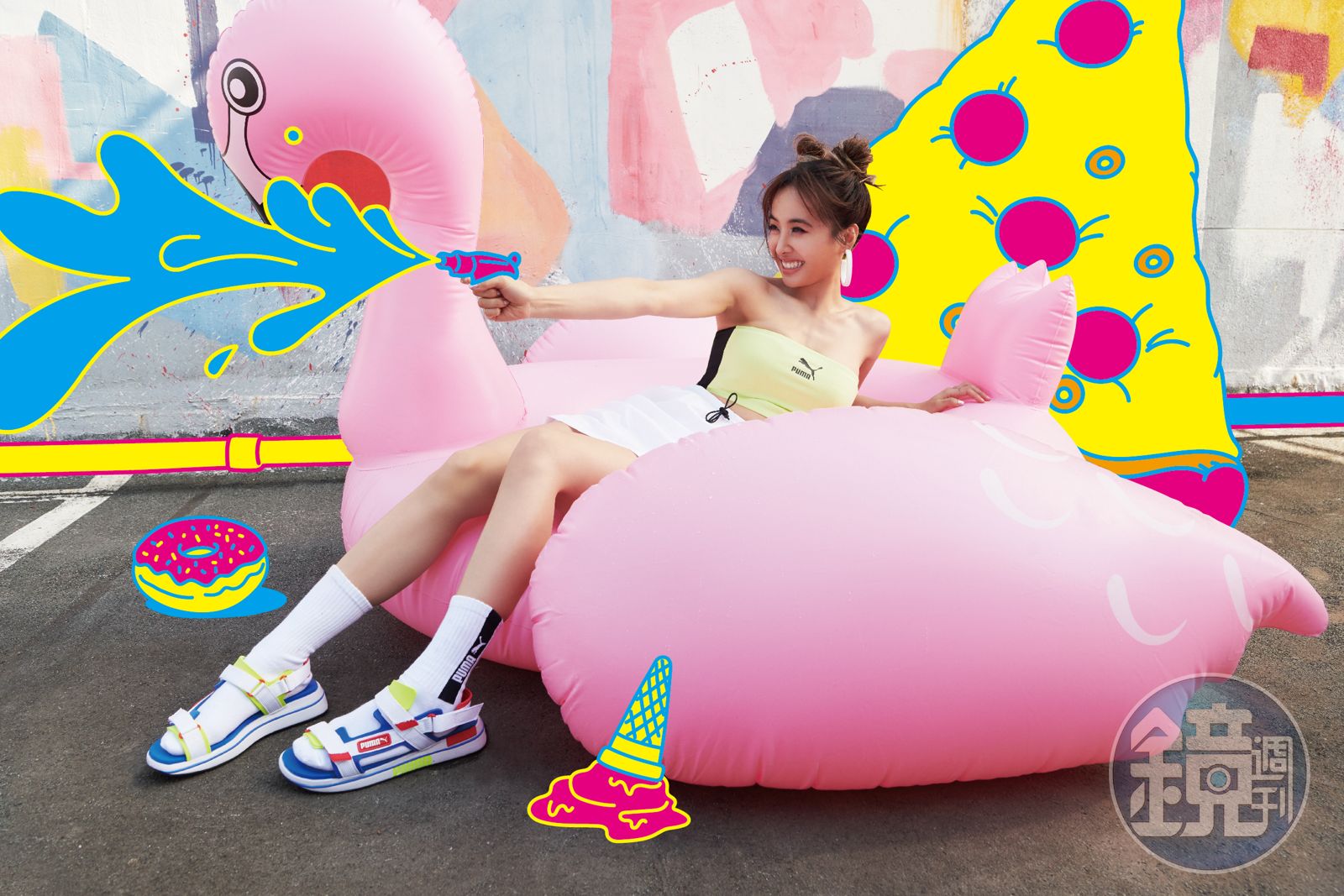 Jolin自今年年初入主PUMA女力天后陣容後,動作頻頻,本次釋出的形象大片中,她身穿沁藍螢光色PUMA Future Rider Sandal搭配同色系螢光平口背心與白色短風裙,時而拿起水槍偷襲,時而在躺椅上享受盛夏陽光,為此刻的高溫注入清涼消暑活力。