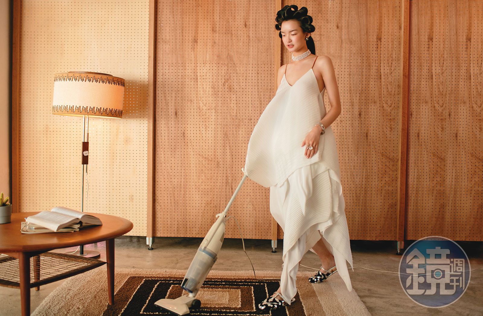 白色細肩帶傘狀背心 NT$46,000 by LOEWE/白色不規則裙襬長裙 NT$51,000 by LOEWE/銀黑色涼鞋 NT$32,000 by PRADA/大溪地黑珍珠鑽石耳環 價格店洽/日本AKOYA珍珠鑽石頸鍊 價格店洽/ART-DECO鑽石手鍊 價格店洽/(左)弧線鑽戒 價格店洽/(右)南洋珍珠交錯鑽戒 價格店洽 All by GEMMIE JEWELRY。