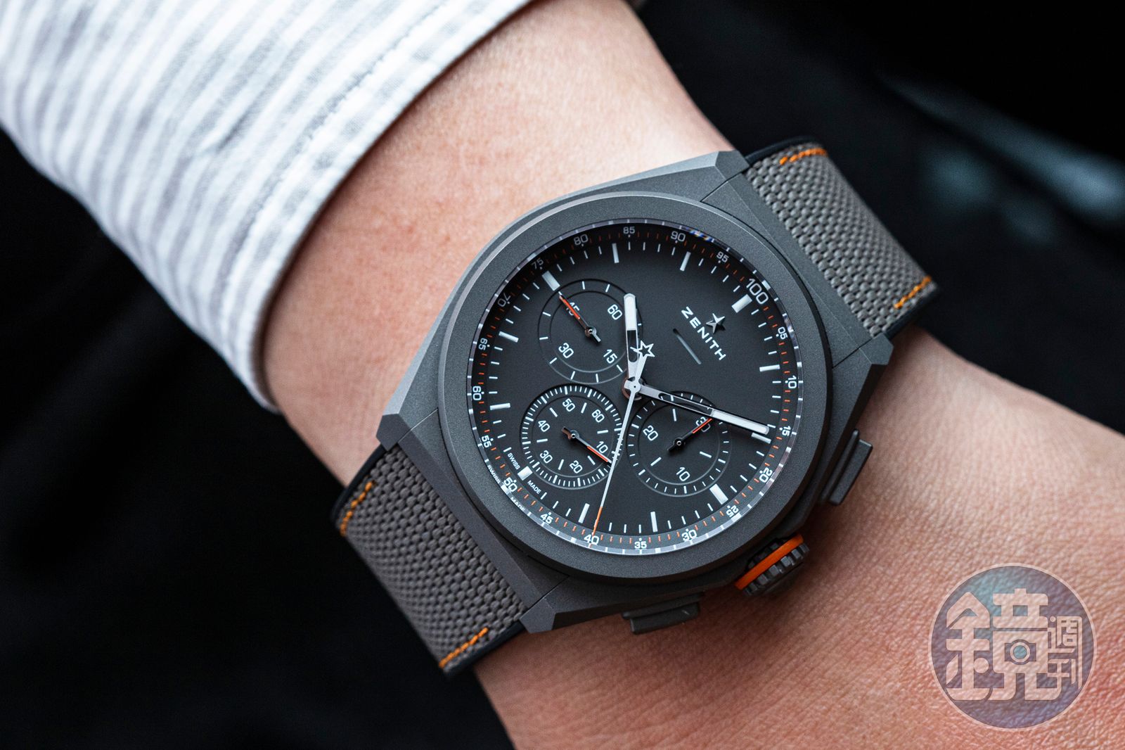 除了既有殼型的風格之外,Defy El Primero 21 LAND ROVER Defender聯名限量腕錶也選擇以噴砂鈦金屬材質錶殼,質感更為粗獷;相較之下,橘色的點綴倒賦予了這款腕錶童趣的一面,猶如玩家駕駛著LAND ROVER Defender車款一樣,在剛強外表下藏著欲征服地表的玩心。另外還有一些很直觀的設計做法:透明後底蓋可見自動盤,其造型即是由輪圈來設計,甚至在自動上頭也打上LAND ROVER字樣;面盤上12點鐘的線性式動力儲存顯示是ZENITH首度使用的配置,呼應儀表板的簡約風格之餘,更像是方向盤上的Defender銘板。