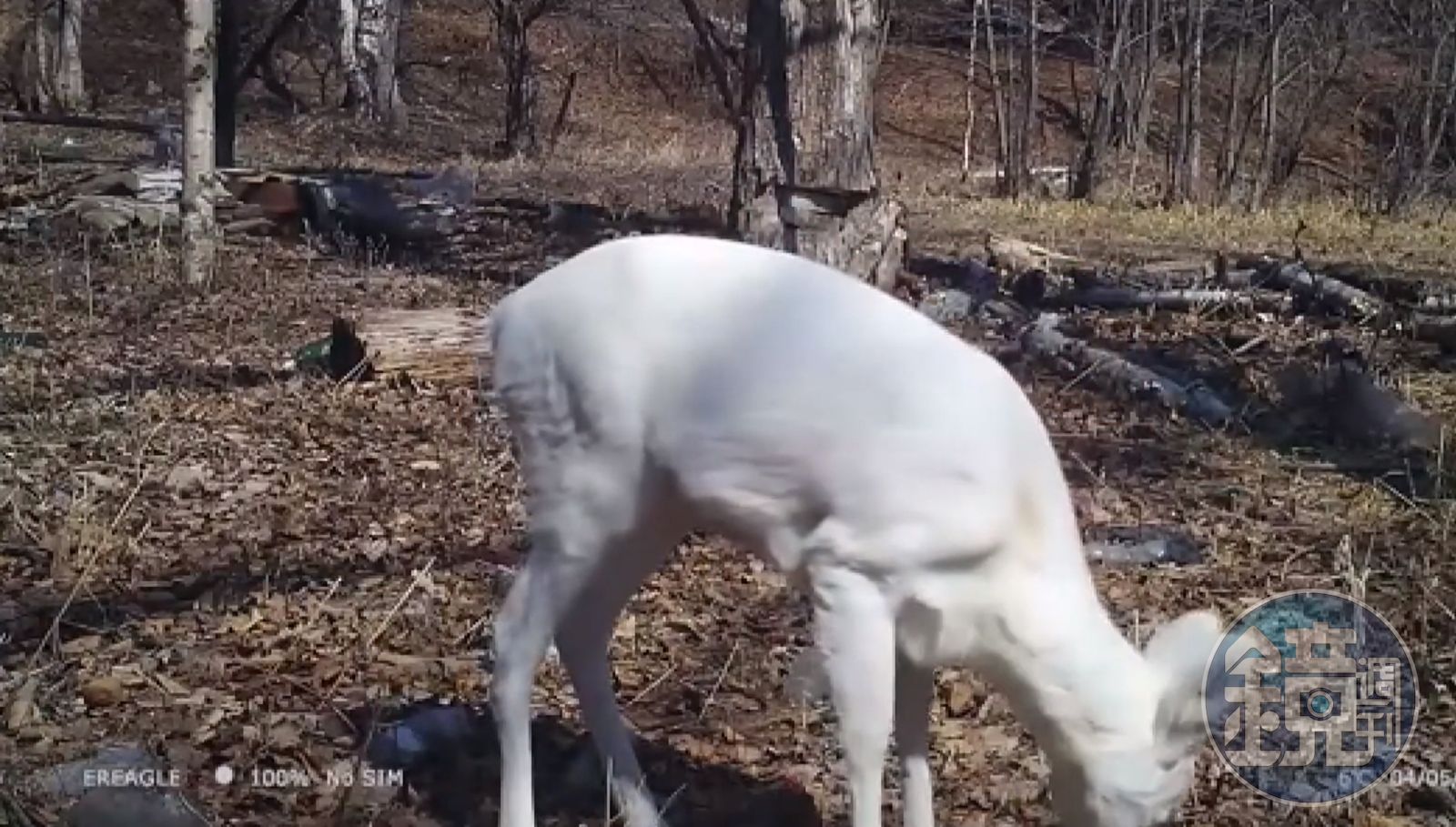東北虎豹國家公園管理局提供的畫面顯示,拍攝時間為4月5日下午1點,1隻全身雪白的動物出現在紅外線相機面前,專心地低頭覓食,經專家鑑定發現是野生白化麅子,相當罕見,上次出現已經是39年前。