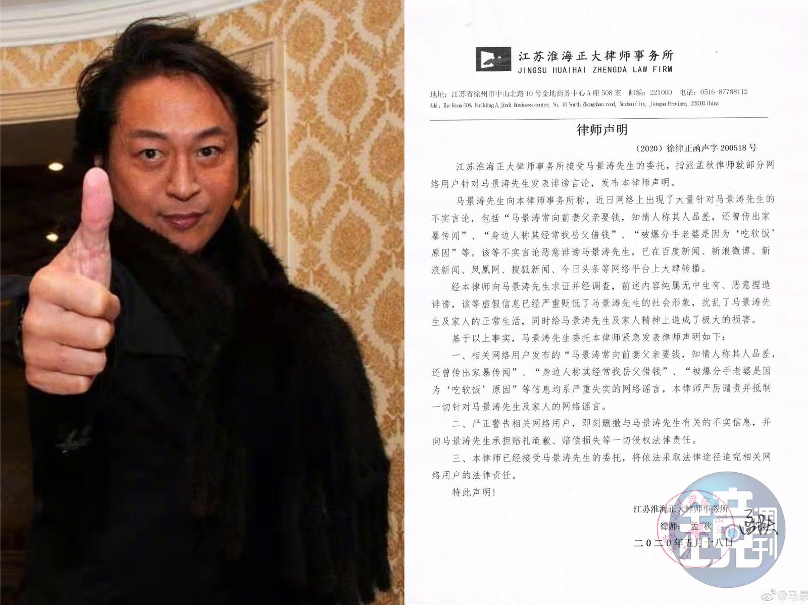 馬景濤對於日前網路上指稱「馬景濤常向前妻父親要錢,知情人稱其人品差,還曾傳出家暴傳聞」等不實爆料感到憤怒,怒斥該內容是「無中生有、惡意捏造」,宛如「網路病毒」,消息一出已經重創了他的形象,也影響了他的家庭生活。因此馬景濤透過律師發出聲明予以譴責,並要求撤除相關文章,給予賠償道歉等等。