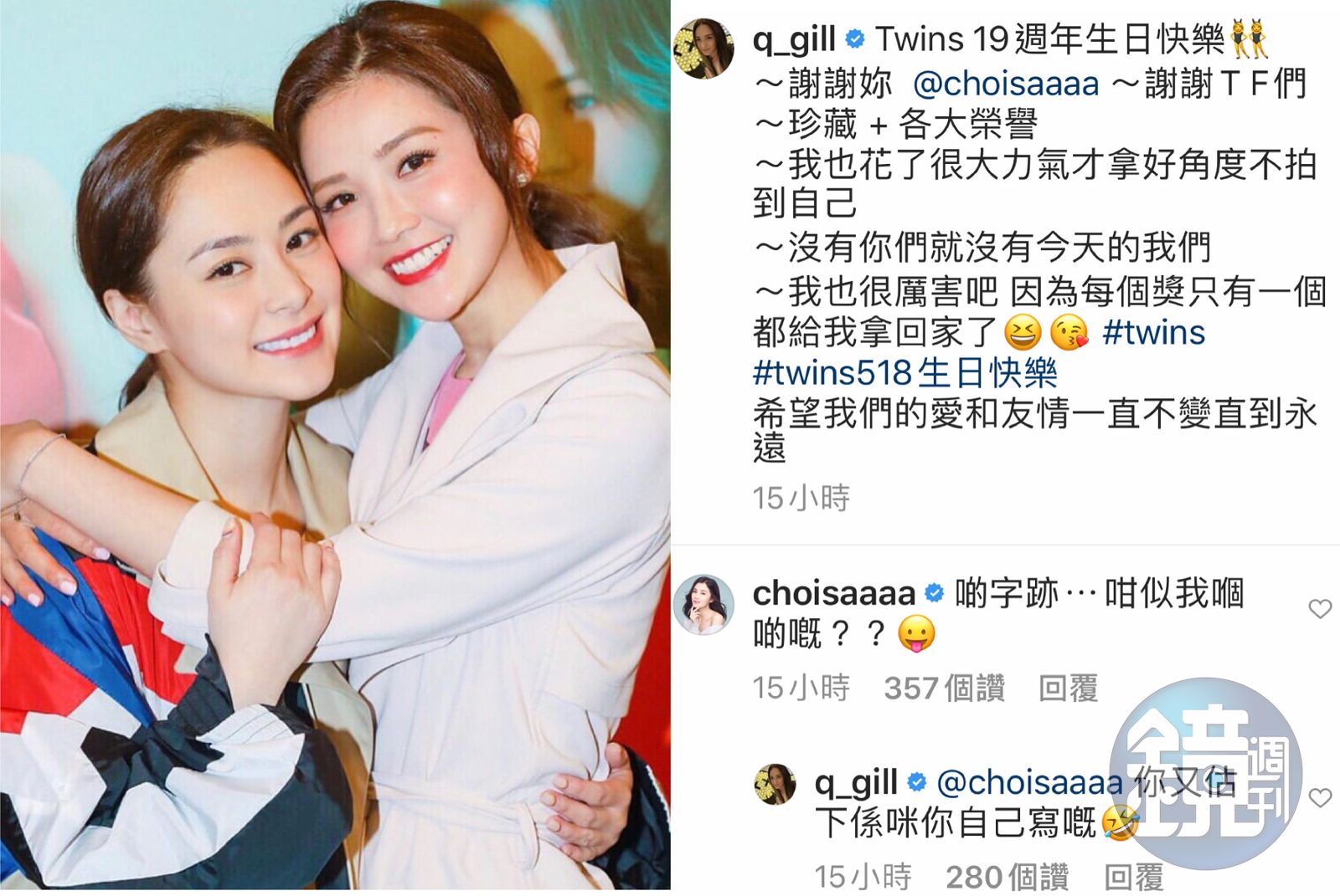 阿嬌在IG貼上「Twins」出道多年來所得到的獎座與獎牌,外加一張多年前的合照,並標註「阿Sa」蔡卓妍,感性向搭檔與粉絲表達謝意,「沒有你們就沒有今天的我們」,更期許「希望我們的愛與友情一直不變直到永遠!」 看到搭檔更新狀態,阿Sa也在第一時間開心回覆,但似乎阿嬌貼的合照時間過於悠久,她直問「那字好像是我寫?」阿嬌也俏皮回答「你猜是不是呢?」兩人鬥嘴般應答,讓一旁粉絲們直覺有趣,阿嬌也似乎不受婚變風暴所影響,兩人感情依舊。
