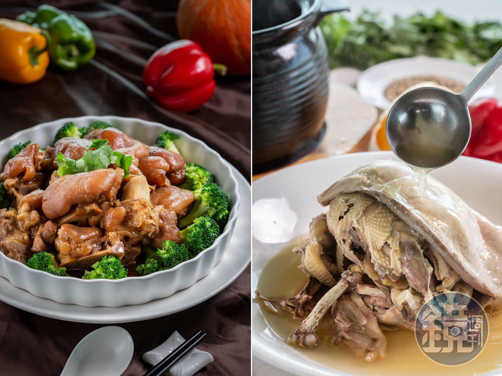 蔡師傅不僅兩廣菜做得好,燒豬腳的功底也紮實,不靠蔥、薑、八角等辛香料遮掩,「滷豬腳」僅用醬油、冰糖、水,「這個豬腳滷得不能太爛,把汁收濃了,皮的膠質就會出來。」簡單卻不簡單的功夫,也一次虜獲兩位政壇大老。「以前林洋港先生最喜歡這道菜,後來蕭萬長先生來了,聽說有這道菜,也說好吃。」