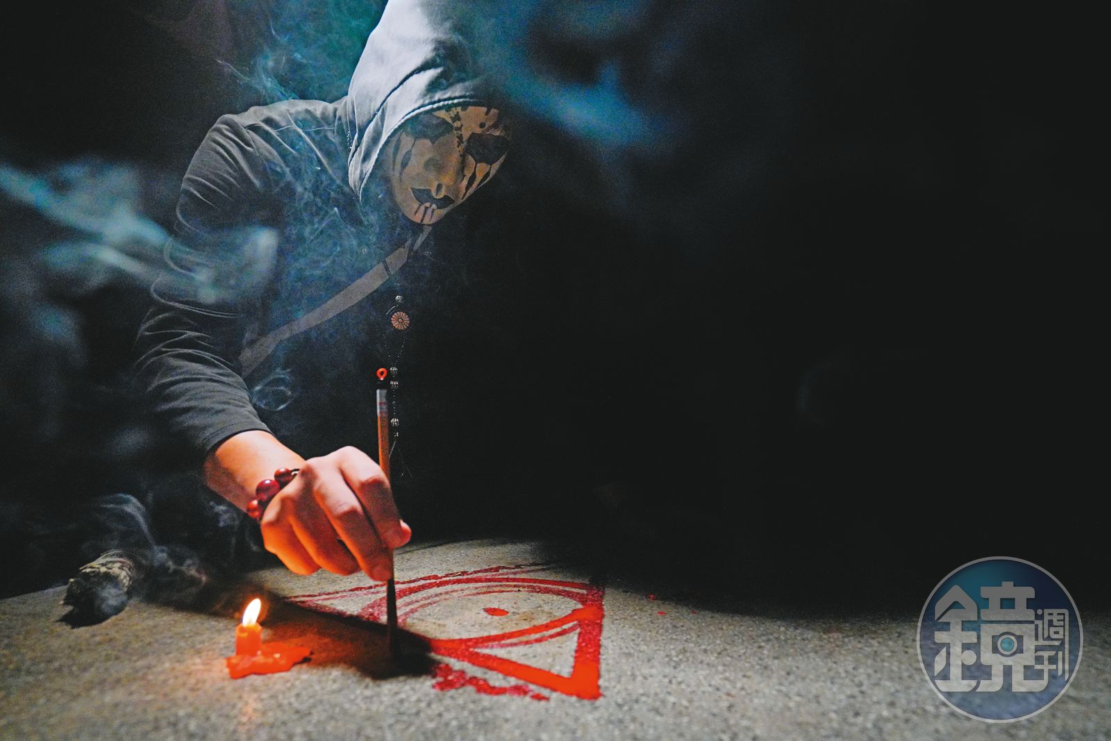 記者表明意願之後,鬼Man在涼亭桌面2側點上2根蠟燭,並將手指伸進白色面具裡用力咬破,將手指的鮮血與紅色顏料混合,畫起召喚靈體的魔法陣。鬼Man解釋,這些顏料也是用自己的血與其他混合物調製而成。