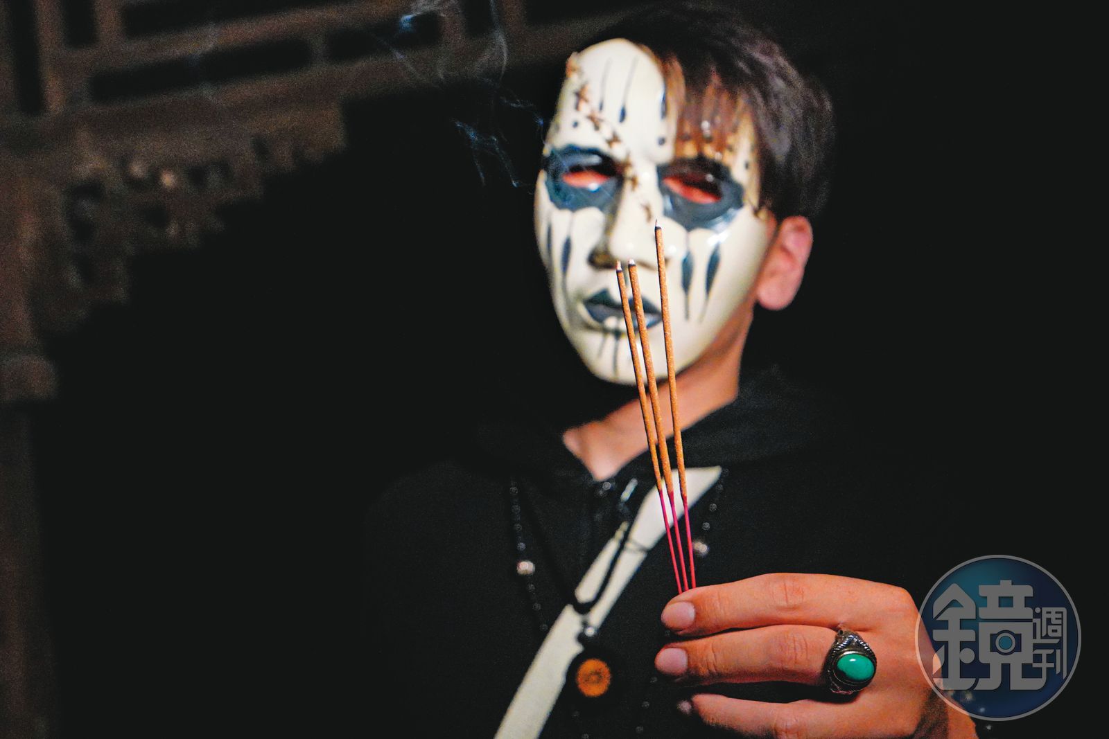 鬼Man畫魔法陣前,先取出從土地公廟拿來的3柱香,開始「作法」,並將香插在涼亭外的地上。他告訴記者:「這叫『香占卜術』,若順利,待會兒會有各路『好兄弟』前來,屆時就會看到3柱香燒成『一長兩短』,也就是3柱香中,有2柱會燃燒得特別快。」