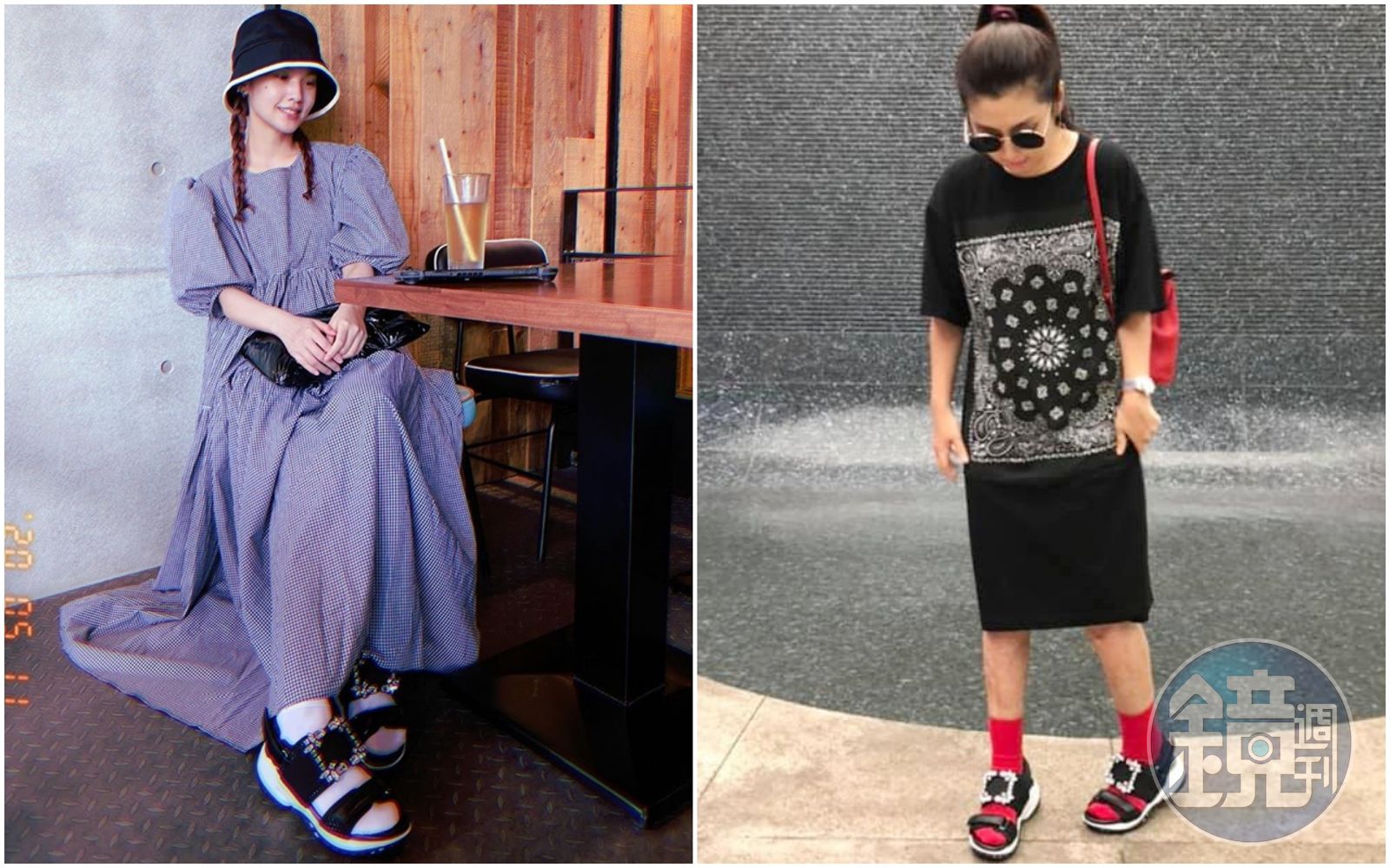 楊丞琳(圖左)與Selina先後穿上同款Viv’ Run鑽扣老爹涼鞋亮相。(迪生提供)發布時間:2020.05.24 08:13 臺北時間