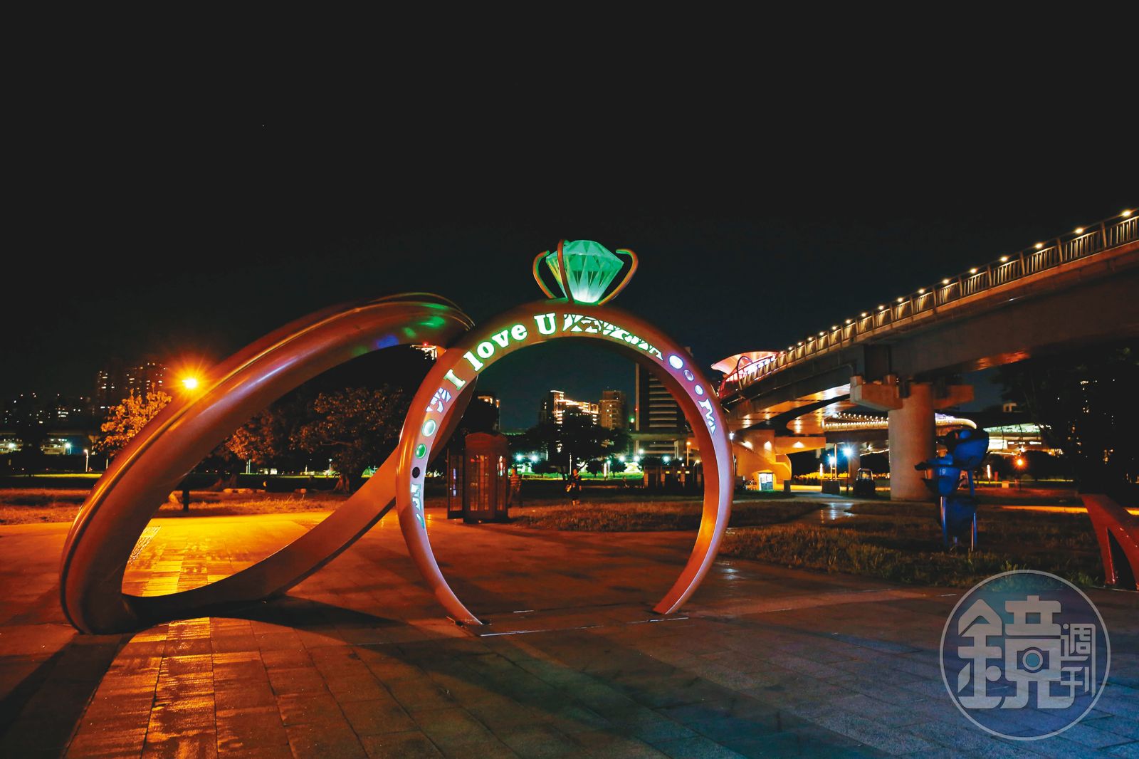 約1層樓高的新月橋鑽戒布景(圖),意外與愛情摩天輪的設計概念極為相似。新北官員表示,市府針對連外橋梁設計主題,在朱立倫擔任市長時代,就有產業鏈的構想,只是宣傳沒有韓市府的愛情產業鏈響亮,侯友宜上任後的河岸「幸福3部曲」,首部曲是三重辰光橋愛情樹,先「鎖」住愛情後,再到2部曲新莊新月橋,在月亮及大鑽戒等裝置藝術所營造的浪漫下求婚,3部曲則來到八里渡船頭拍婚紗,「這是整套的,是誰先做的,資料拿出來就見真章了。」