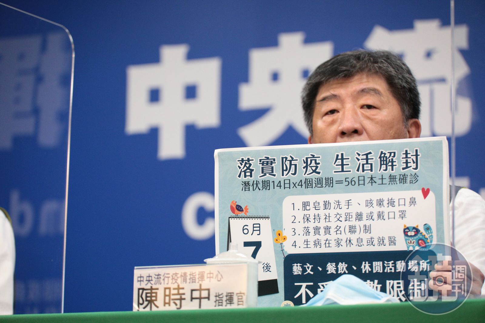 指揮中心指出,國內迄今已連續44天(超過3個潛伏期)無本土病例,顯示民眾於國內正常作息相當安全,因此若在6月7日(4個潛伏期滿)仍可維持本土病例零確診或無社區感染,將擴大鬆綁生活防疫規範,民眾只要配合實名(聯)制,及落實個人防護措施(勤洗手、無法維持社交距離或搭乘大眾運輸時佩戴口罩),從事各項日常及休閒活動將不再受限於人數規範。