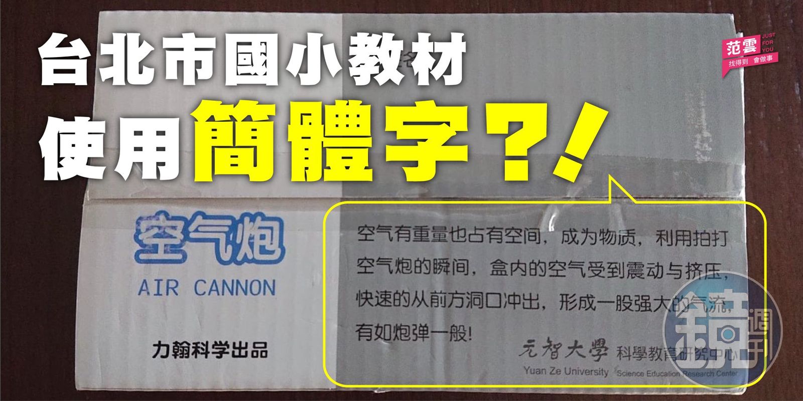 范雲貼出的照片,可見課後社團的教材,包含動物分類卡牌、空氣炮等教具,上頭字樣使用皆為簡體字;而教材翻開首頁雖為繁體字,但內容卻直指「已開發完成幼兒園到初中2年級10個年齡段的科學課程,在中國(包含香港及台灣)有50個城市超過2,000所學校引進合作。」