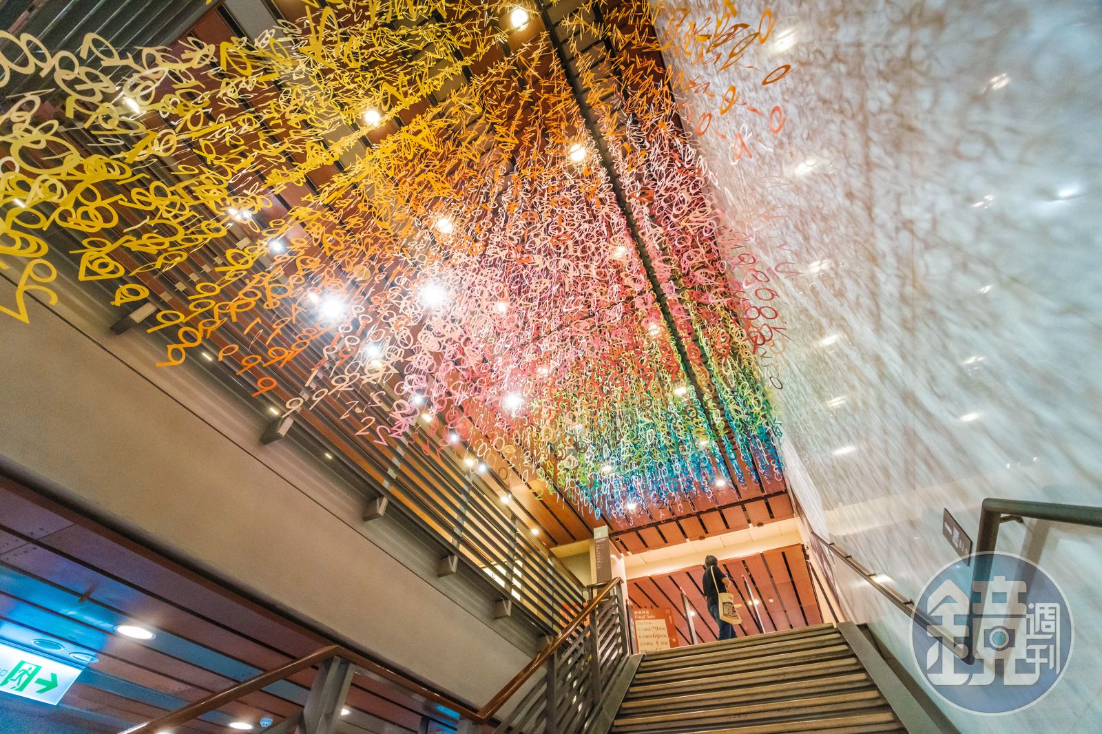 通往2樓樓梯間,8千片彩色「1989~2020」剪紙串連,象徵誠品創立以來的日子軌跡。發布時間:2020.05.26 17:30 臺北時間