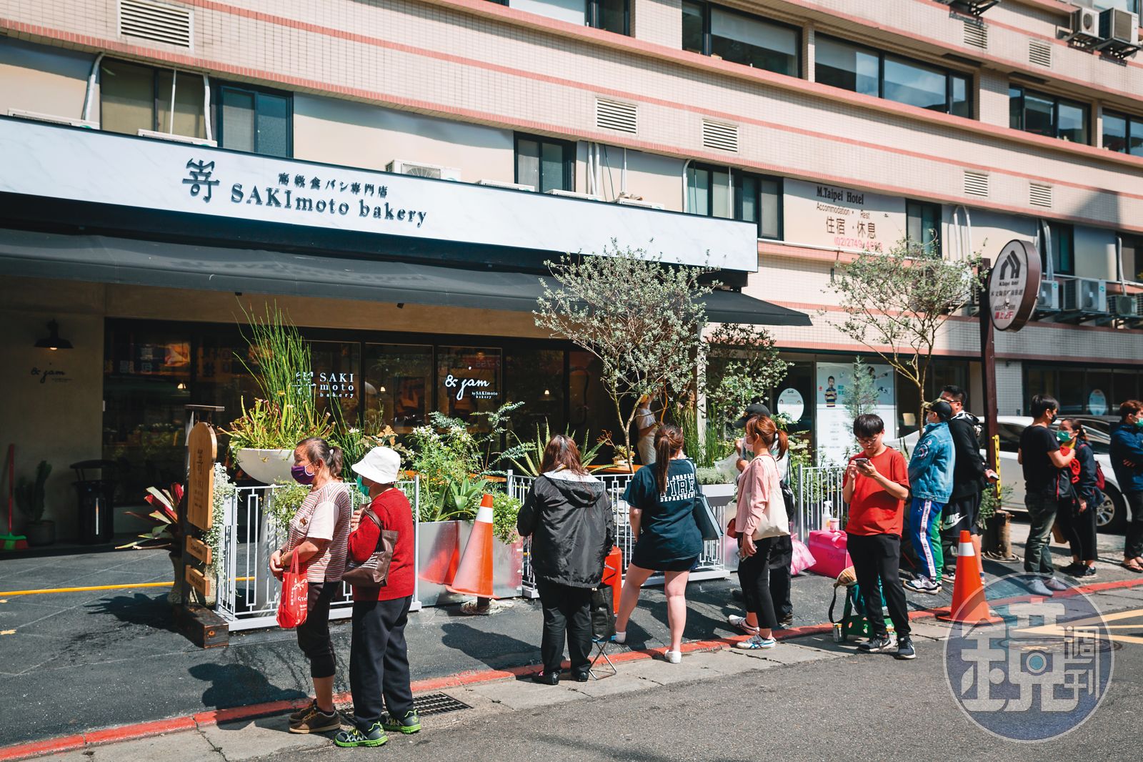 早晨9點半,台北忠孝東路5段巷內排隊人潮已綿延2個街區,等候領取號碼牌購買每人限購3條的生吐司。第一號排隊者凌晨4點就來嵜本SAKImoto Bakery排隊,執行長曾柏憲在旁緊盯流程,擔心客人久候生氣,「前幾天還有對夫妻前一晚就來排,自備睡袋在店門口睡一夜。」