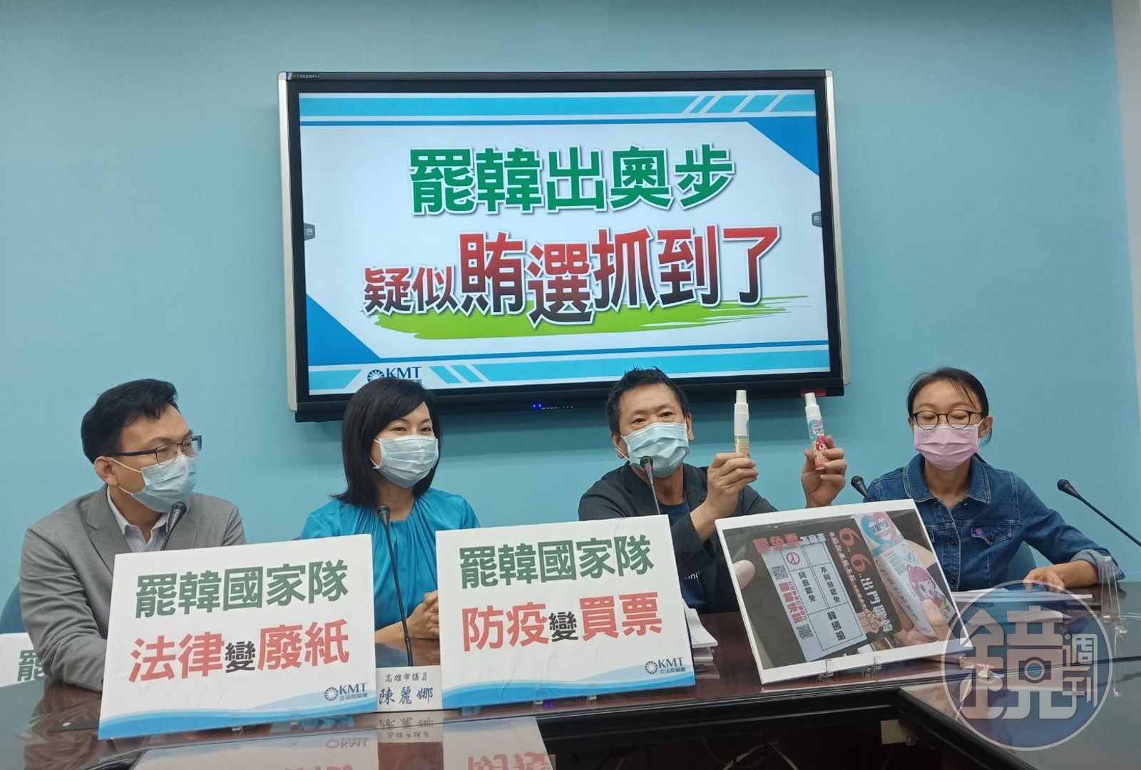 國民黨立院黨團總召林為洲上午與立委鄭正鈐、吳怡玎、洪孟楷和高雄市議員陳麗娜等人,召開記者會指控罷韓團體疑似賄選。林為洲拿出2瓶茶樹精油乾洗手,表示這是他們支持者在罷韓宣傳攤位旁拿到的,還當場放出錄音片段證明。林為洲稱罷韓送的乾洗手,每瓶市價賣130元,他們實際到工廠問,原價是1瓶100元,「我如果講錯,或是沒有真實的狀況,請他們趕快提告我,講話要負責任」。