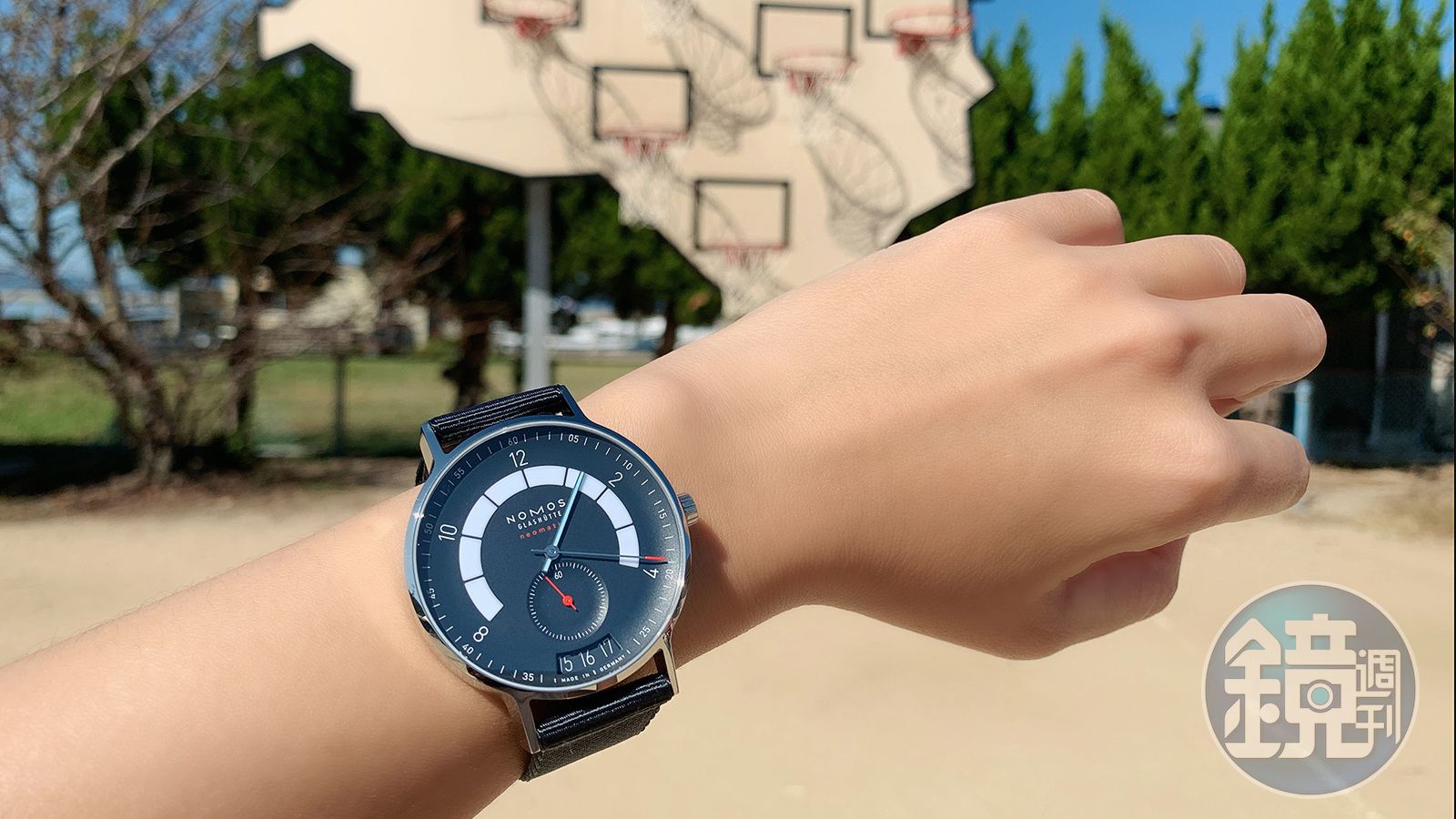 佩戴心得:第一次看到Autobahn的時候有點驚豔,它很NOMOS、卻又沒那麼NOMOS,在NOMOS的眾多錶款中,Autobahn的設計算是比較張揚的,光是它面盤中央的夜光圈就夠搶眼的了,乍看下真的滿有新鮮感。不過戴了幾天之後突然有點懷念起NOMOS以往的簡約風格,就個人喜好而言,Autobahn的耐看性對我來說比較薄弱。加上可能因為這次試戴的是藍面,橘色分針被映襯得太鮮明,而藍色夜光塗料的時針,在大太陽下也很容易被藍面的底色吃掉,看時間時很常一眼瞄過去只看到分針,時針還需要掃一下才找得到,辨識度沒有這麼高。另外,41mm的大尺寸但是搭的是比較輕薄的織紋錶帶,所以支撐力感覺比較沒那麼強,戴久了會覺得錶頭有點重,不過也不是每個人都主張手錶戴起來要感覺很輕的訴求,起碼錶帶的觸感戴久了是滿舒服的。而且Autobahn的面盤細節設計真的做得滿到位,內凹式的錶面為它加了不少分,弧度彎得滿漂亮,時標和日期用的字體也一如以往選得很好,或許對於第一次買NOMOS的人來說,它會有點重口味,但如果你在考慮你的第二只NOMOS,Autobahn會是滿不錯的入手選擇。