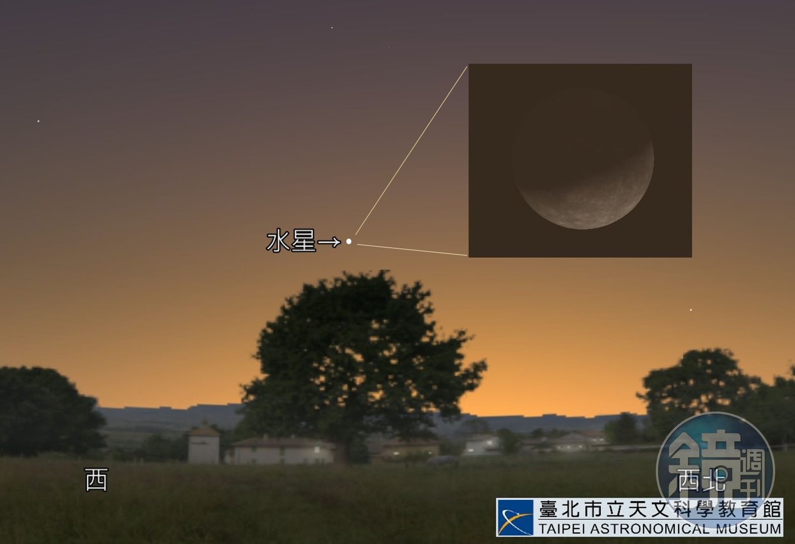 天文館補充,此次水星東大距將出現在日落後的西方天空,最佳觀測時間為6月4日晚上5至7時,最佳觀測點為西部海岸線,也可前往高山向西邊看;即使無精密設施,民眾也能肉眼就清楚看見,不過若使用口徑20公分以上天文望遠鏡放大觀察,更能見到弦月般的外觀。