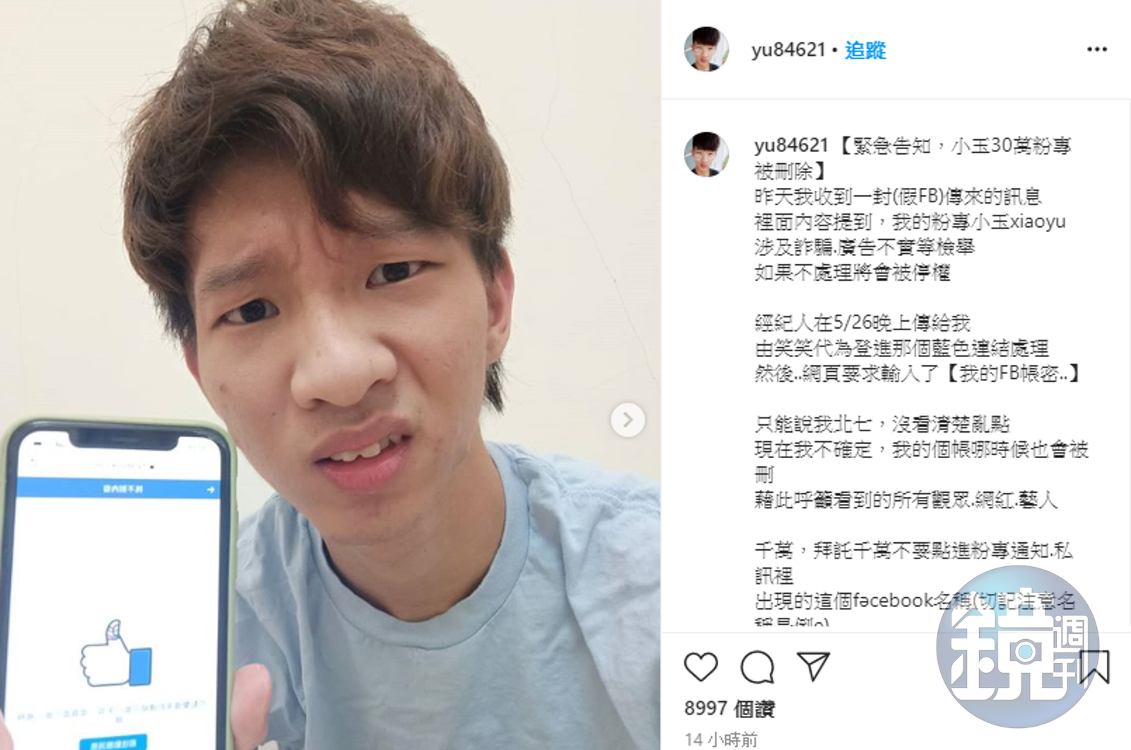 小玉表示,26日時收到一封「假冒是臉書官方」傳來的訊息,內容告知他的粉絲專頁涉及詐騙、廣告不實,如果不處理就會遭到停權,而他在沒有看清楚的情況下,在網頁輸入了帳號與密碼,粉絲專頁就這樣被刪除了,「只能說我北七,沒看清楚亂點,現在我不確定,我的個帳(個人帳號)哪時候會被刪。」他也藉機呼籲所有的粉絲、網紅、藝人,不要點進私訊裡出現的「fəcebook」,此外他也透露正在尋求申訴管道,但情況不樂觀,已經做好最壞的打算。