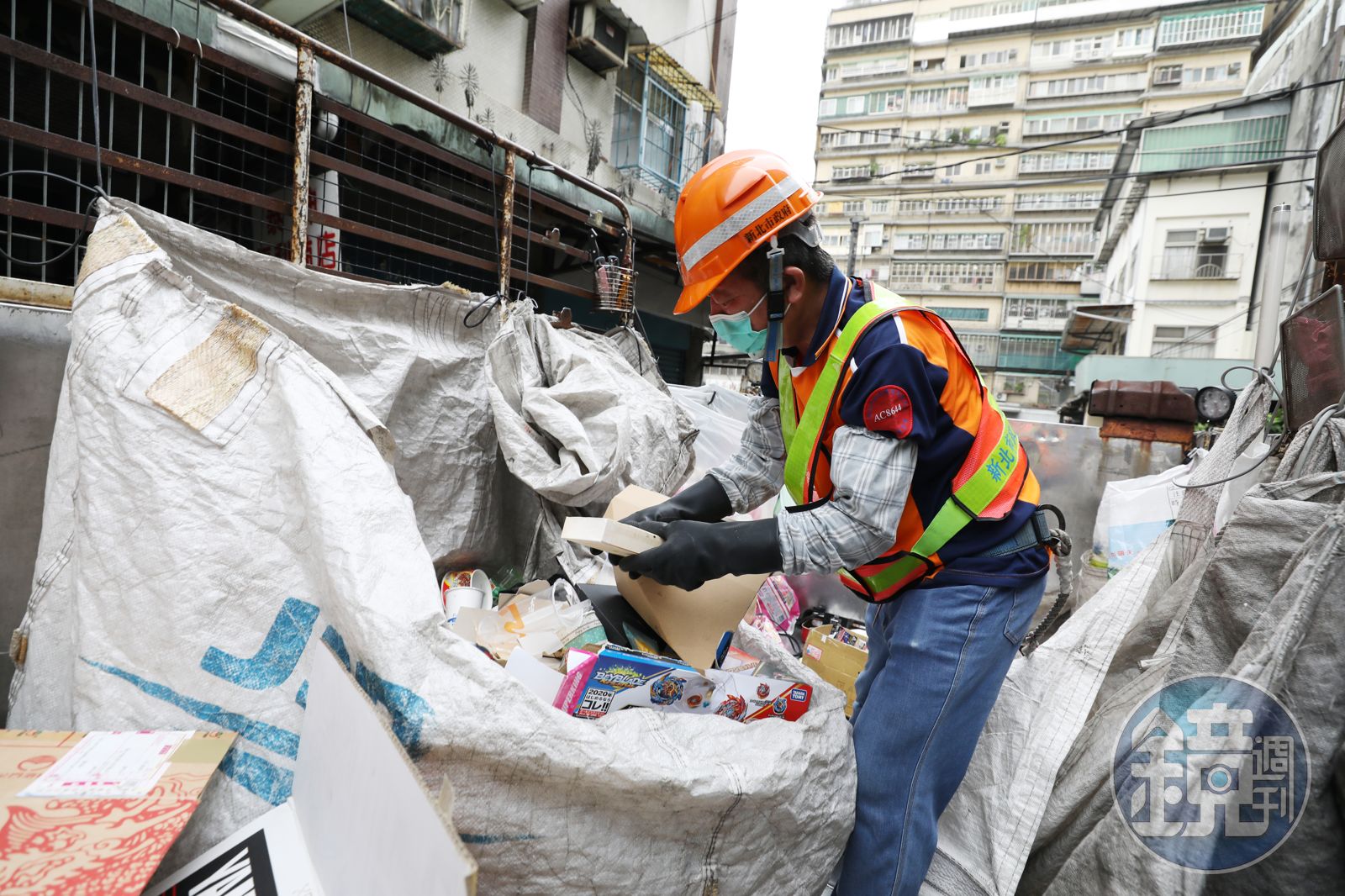 站立車上已危險,還得忙著分類,我們的攝影記者就在拍照時不小心跌倒,幸而沒摔出去。不能等抵達回收場再把民眾的袋子拆開分類嗎?頭不暈嗎?林小姐說,的確有新同事剛上工的頭幾日天天嘔吐,但久了就習慣,「為了賺錢啊,不然怎麼辦?」她說,若不趁空檔快速分類,等車子開進回收場再分類,會增加不少工作時間,事情做不完。