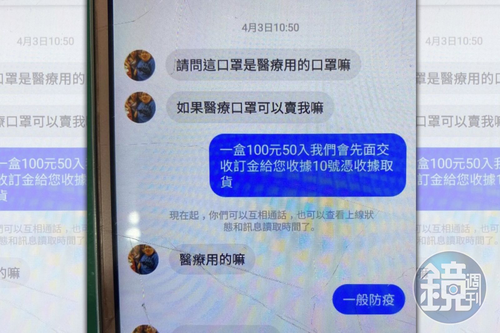 不少被害人信以為真,私訊向洪男洽詢,他則謊稱手上有數量龐大的醫療級、防疫用口罩,每盒50個、售價100元,由於價格低廉,網友趨之若,等對方上鉤後,洪男則表示,必須先收取貨款的一半金額,當作訂金,而在那當下,口罩太搶手了,不少人匯款下訂單,接著,洪男就避不見面,或已讀不回,此時,被害人才驚覺遭詐欺。