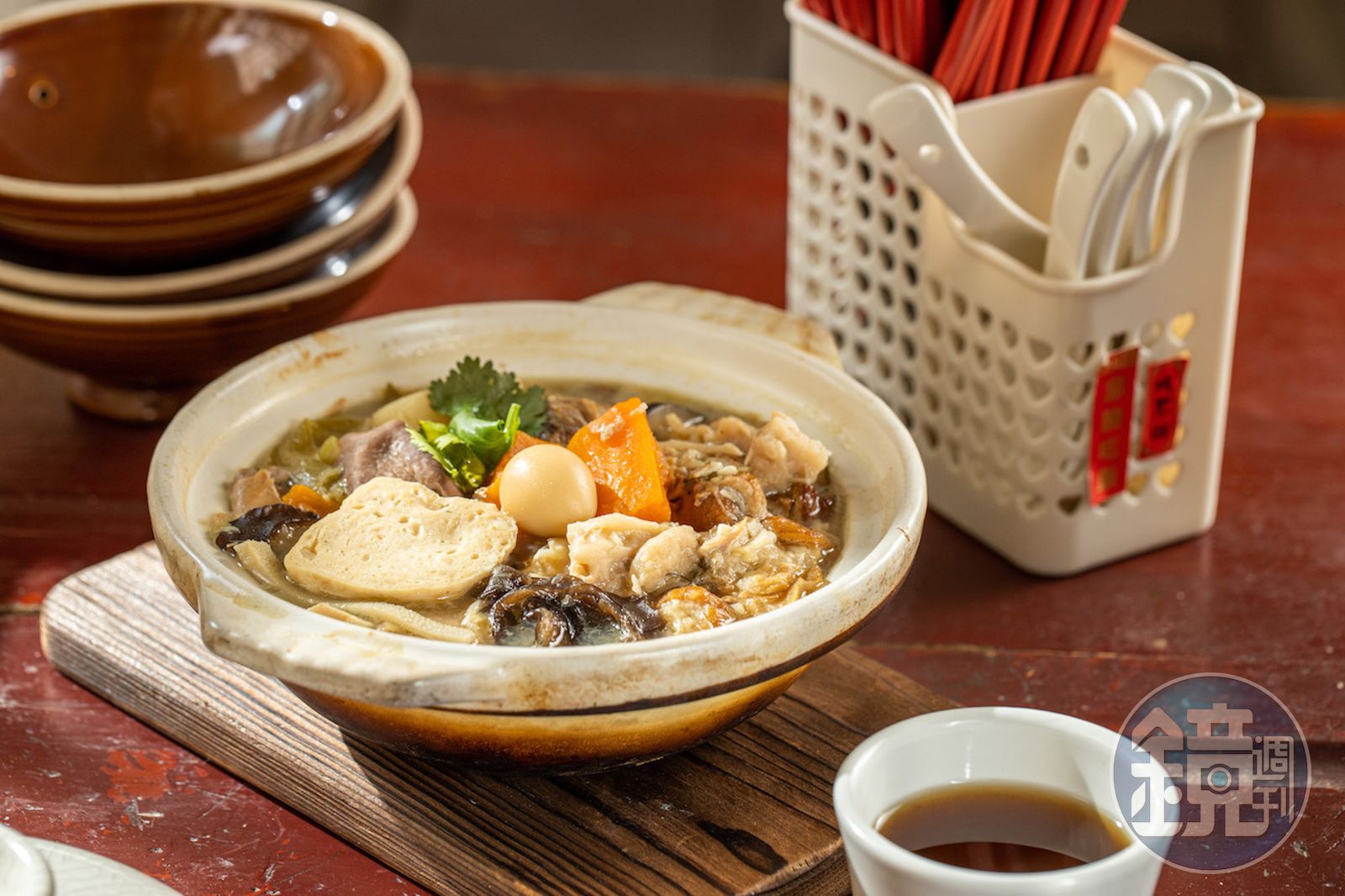 像是要提前預約才吃得到的「雜菜煲」,「用雞骨和豬大骨熬煮的湯頭裡,加入豬肚、雞肉、鵪鶉蛋、筍干、扁魚和白菜,以炭火熬煮後要靜置24小時入味才能上桌。」王基銘堅持時間的深沉味道不得被催促。