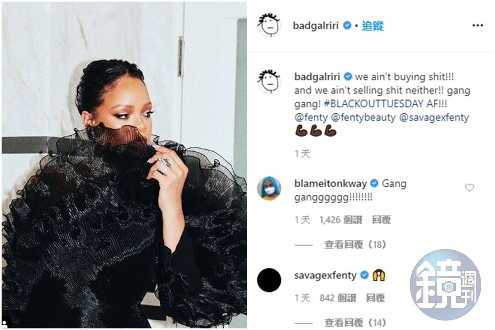 歌手蕾哈娜(Rihanna)旗下的品牌也響應反歧視的「暗黑星期二」活動,旗下品牌全於2日停業一天。(翻攝蕾哈娜IG)發布時間:2020.06.03 18:15 臺北時間