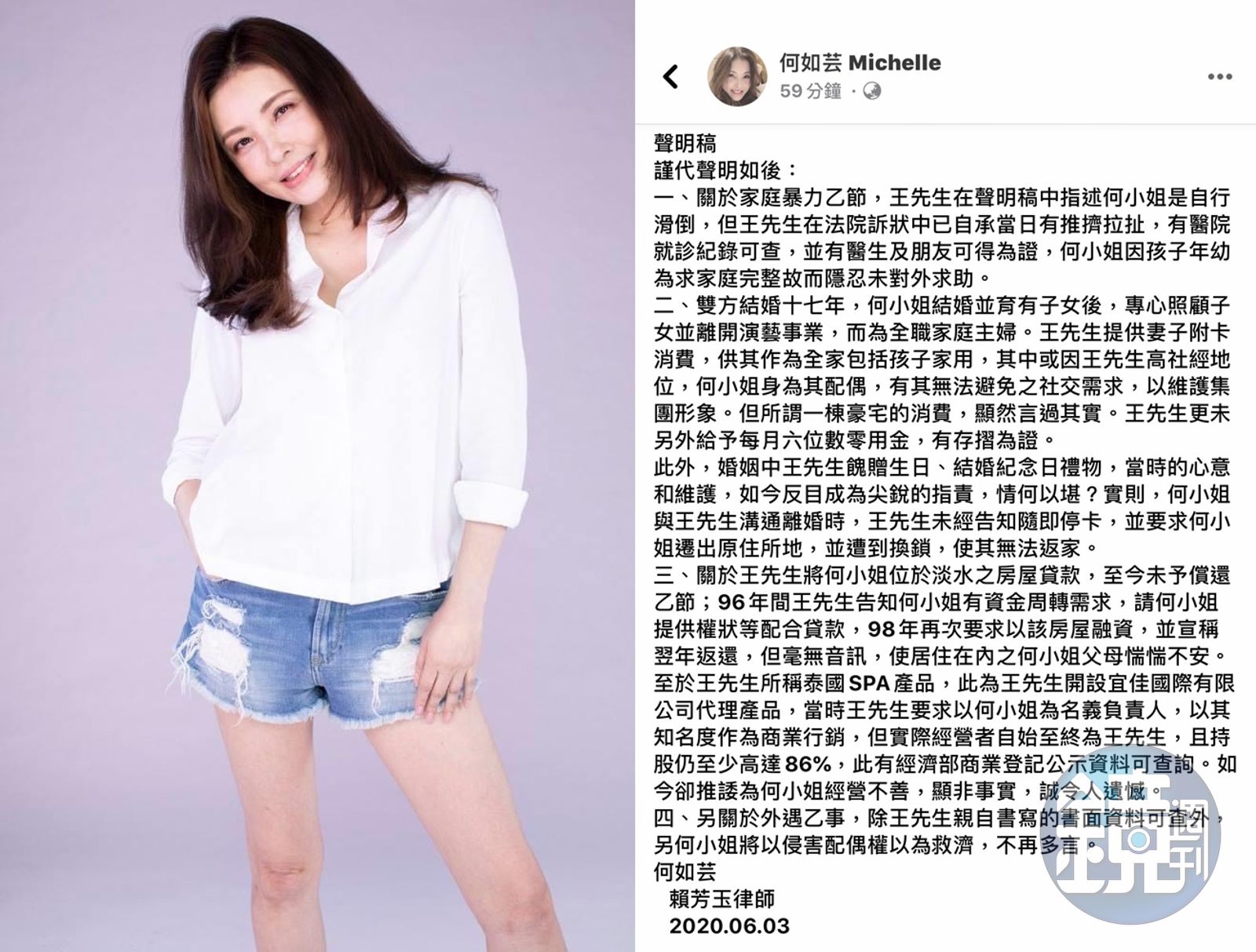 之前,何如芸聲淚俱下控訴老公王敏錡家暴及劈腿,至今兩人仍為離婚鬧得不可開交,對於王敏錡的反控,針對家暴部分,何如芸聲明稱:「王先生在聲明稿中指述何小姐是自行滑倒,但王先生在法院訴狀中已自承當日有推擠拉扯,有醫院就診紀錄可查,並有醫生及朋友可得為證。」