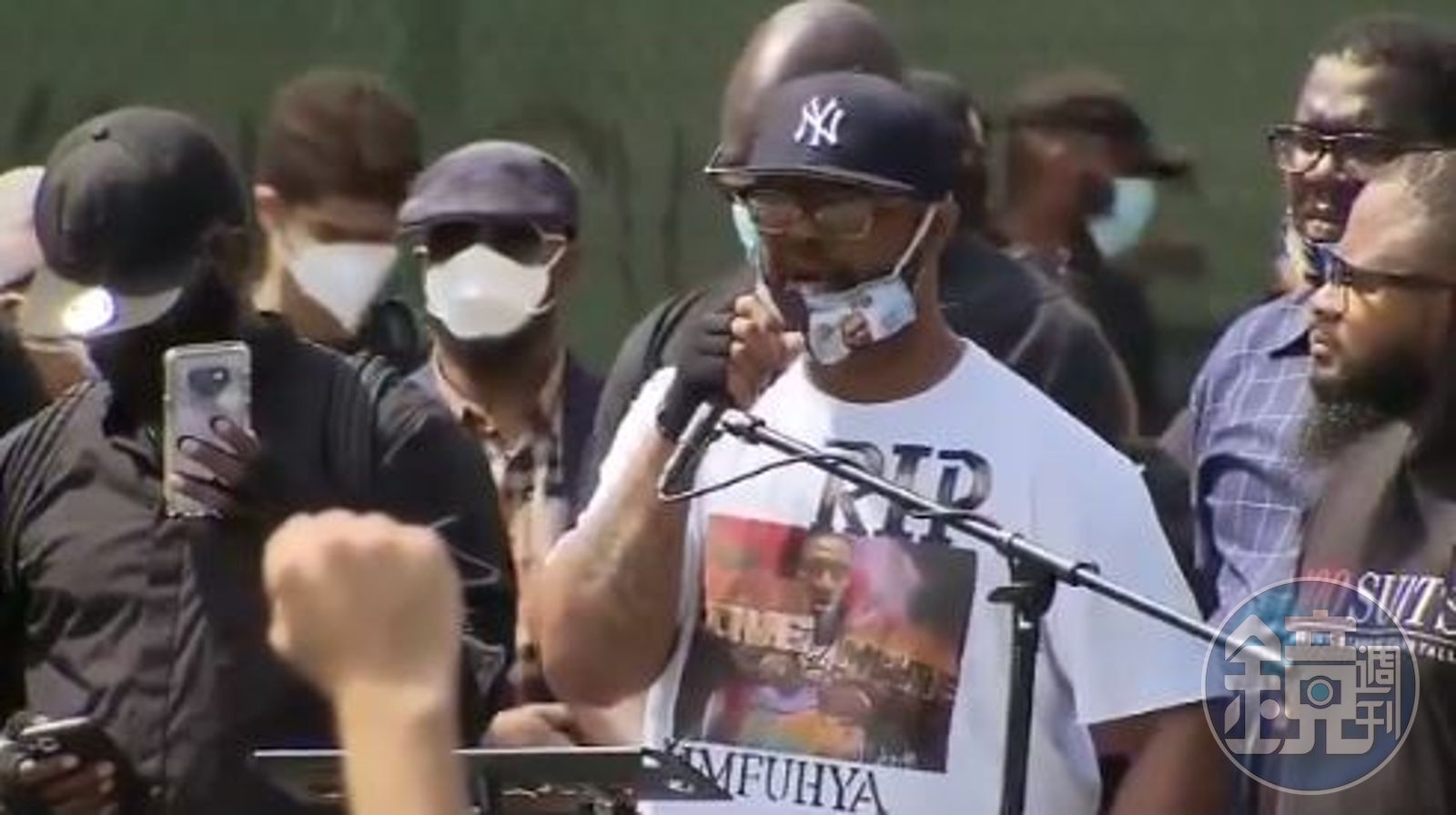美東時間4日下午,布魯克林區卡德曼廣場(Cadman Plaza)舉辦佛洛伊德追悼會,到場人數破千人;佛洛伊德胞弟泰倫斯身穿印有哥哥肖像的上衣和口罩出席,情緒相當激動道「我的兄弟不見了,但是佛洛伊德的名子將永遠流傳。」