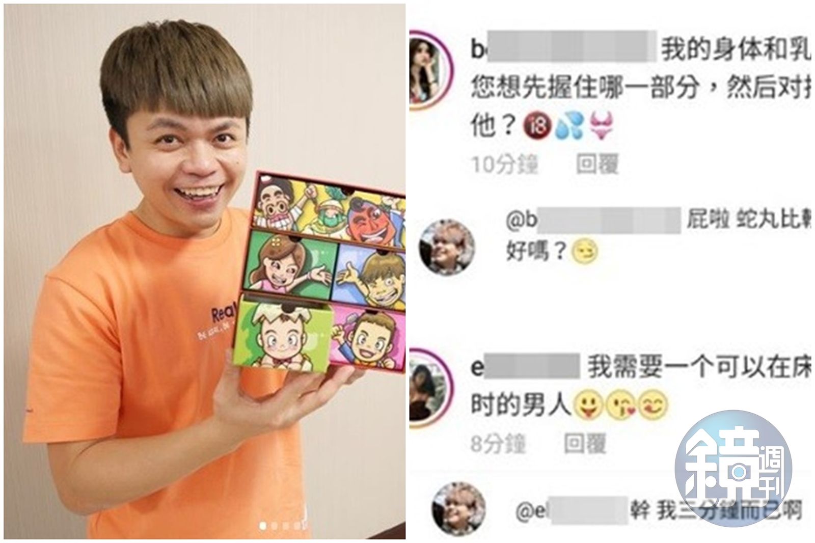 針對正妹狂洗版自己IG,蔡阿嘎沒刪除留言,反跟對方聊起來,聽聞女方說「乳房很大」,秒回:「屁啦,蛇丸比較大好嗎?」另外一名正妹則表示「要找可以躺1小時的男人」,蔡阿哥則神回:「X,我三分鐘而已啊!」最後一人說「我的乳房很漂亮」,他也趁機告白:「你還好!二伯比較漂亮。」